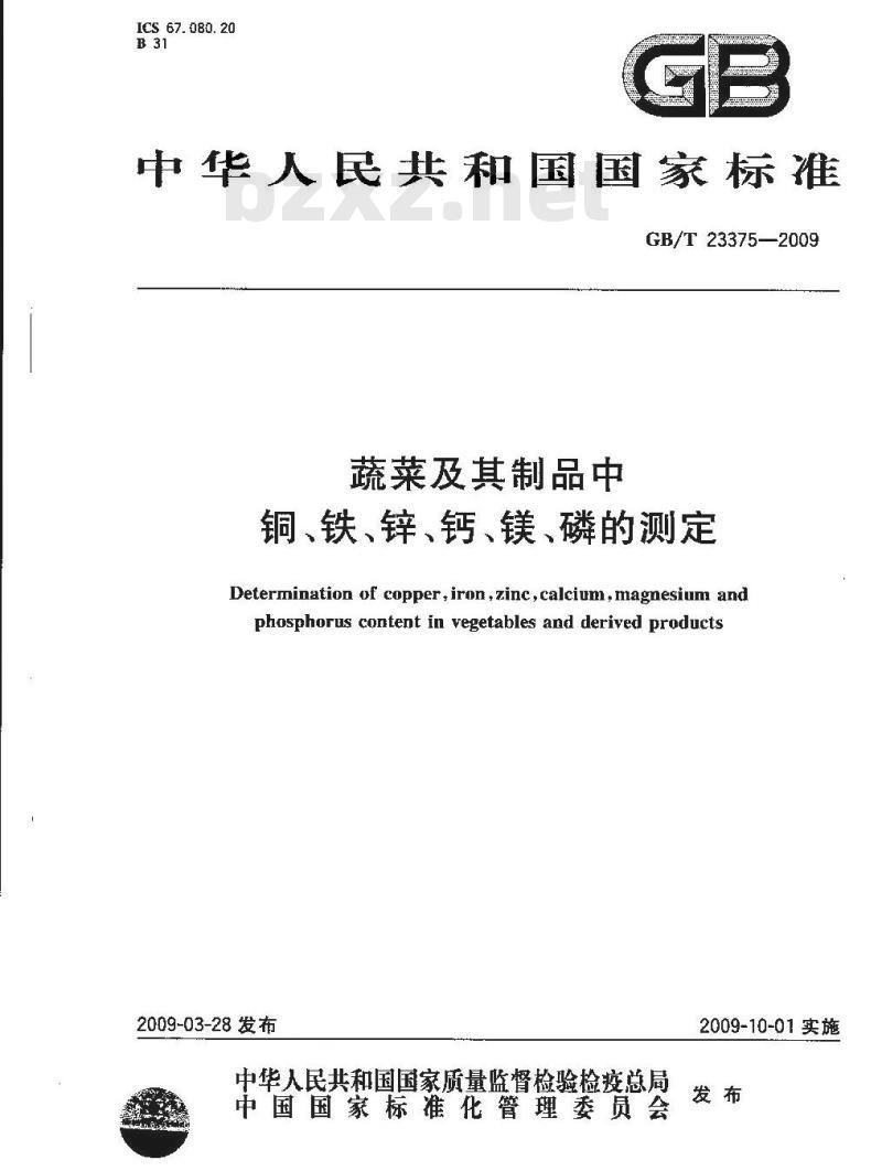 - GB/T 23375-2009 蔬菜及其制品中铜、铁、锌、钙、镁、磷的测定