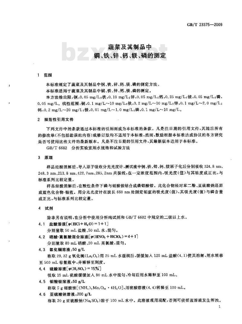 铜、铁、锌、钙、镁、磷的测定本标准规定了蔬菜及其制品中铜、铁,锌、钙、镁、磷的测定方法。本标准适用于蔬菜及其制品中铜、铁、锌、钙、镁、磷的测定。GB/T 23375—2009