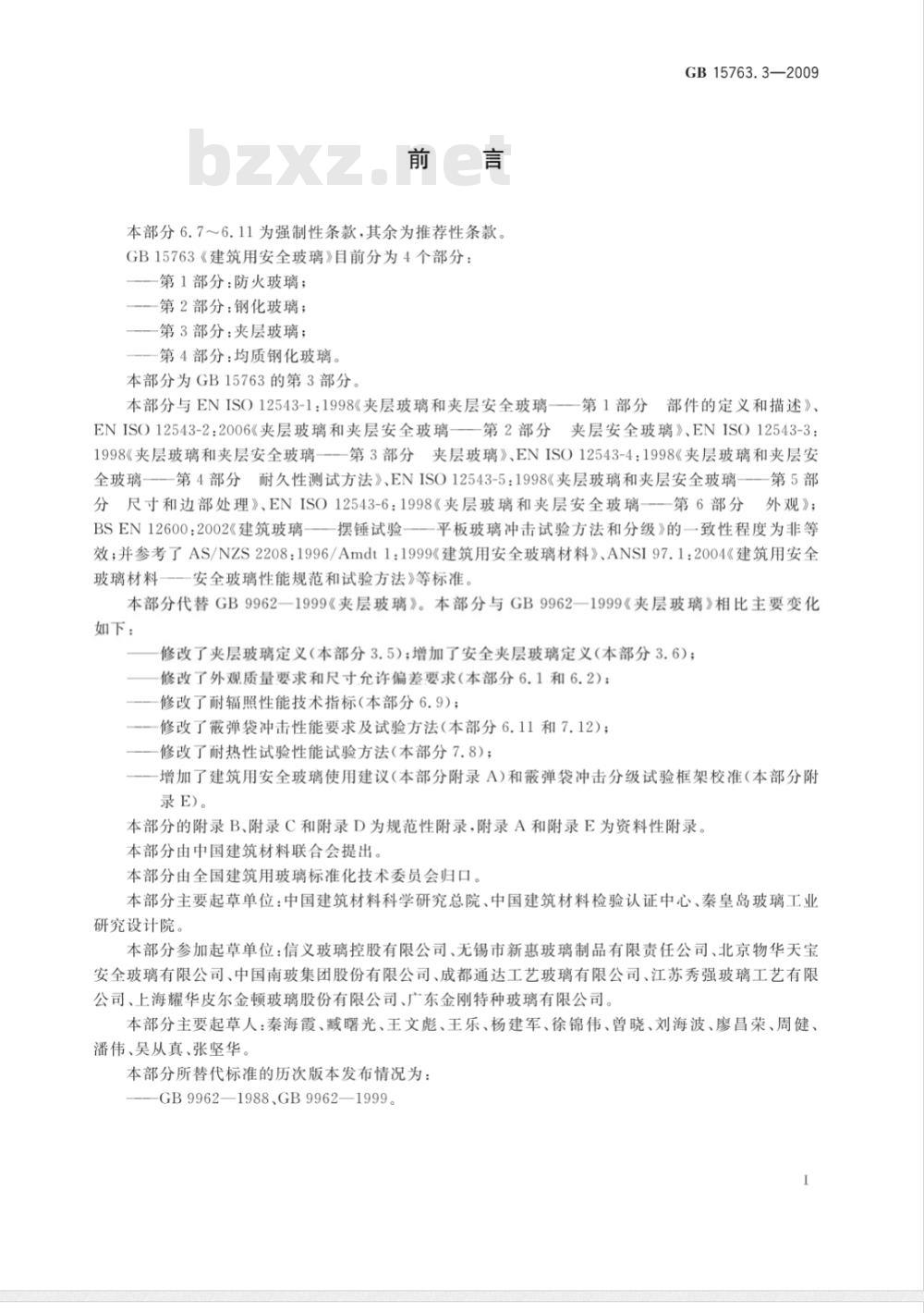 本部分与ENISO12543-1:1998《夹层玻璃和夹层安全玻璃一一第1部分部件的定义和描述》、ENISO12543-2:2006《夹层玻璃和夹层安全玻璃一第2部分夹层安全玻璃》、ENISO12543-3:1998《夹层玻璃和夹层安全玻璃--一第3部分夹层玻璃》、ENISO12543-4:1998《夹层玻璃和夹层安全玻璃第4部分耐久性测试方法》、ENISO12543-5:1998《夹层玻璃和夹层安全玻璃一第5部分尺寸和边部处理》、ENISO12543-6:1998《夹层玻璃和夹层安全玻璃—一第6部分外观》;BSEN12600:2002《建筑玻璃一摆锤试验—平板玻璃冲击试验方法和分级》的一致性程度为非等效;并参考了AS/NZS2208:1996/Amdt1:1999《建筑用安全玻璃材料》、ANSI97.1:2004《建筑用安全玻璃材料一一安全玻璃性能规范和试验方法》等标准本部分代替GB9962一1999《夹层玻璃》。本部分与GB9962一1999《夹层玻璃》相比主要变化如下: