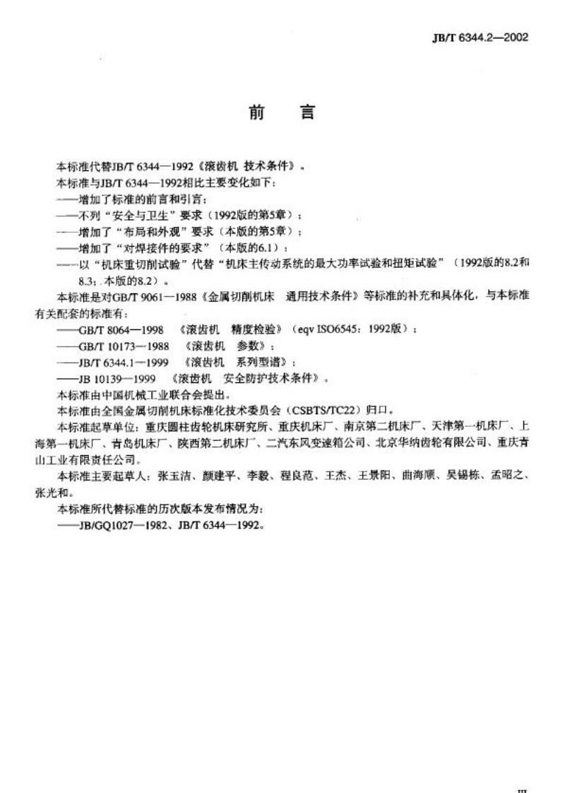 本标准代替JB/T6344一1992滚齿机技术条件本标准与JB/T6344—1992相比主要变化如下:增加了标准的前言和引言: