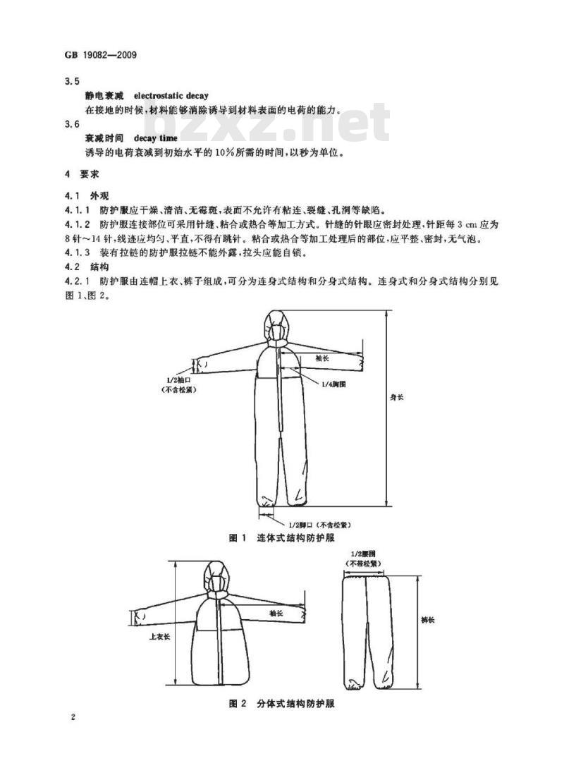 4.1.1防护服应于燥、清清、无霉斑,表面不充许有粘连、裂缝、孔洞等缺陷。4.1.2防护服连接部位可采用针缝、粘合或热合等加工方式。针缝的针眼应密封处理,针距每3cm应为8针14针,线迹应均勾、平直,不得有跳针。粘合或热合等加工处理后的部位,应平整、密封,无气泡。4.1.3装有拉链的防护服拉链不能外露,拉头应能自锁。4.2结构