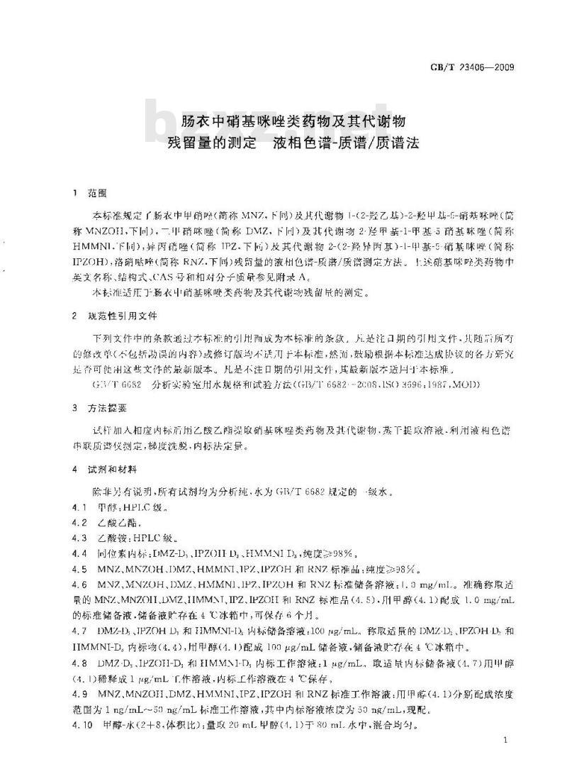 - GB/T 23406-2009 肠衣中硝基咪唑类药物及其代谢物残留量的测定 液相色谱-质谱/质谱法