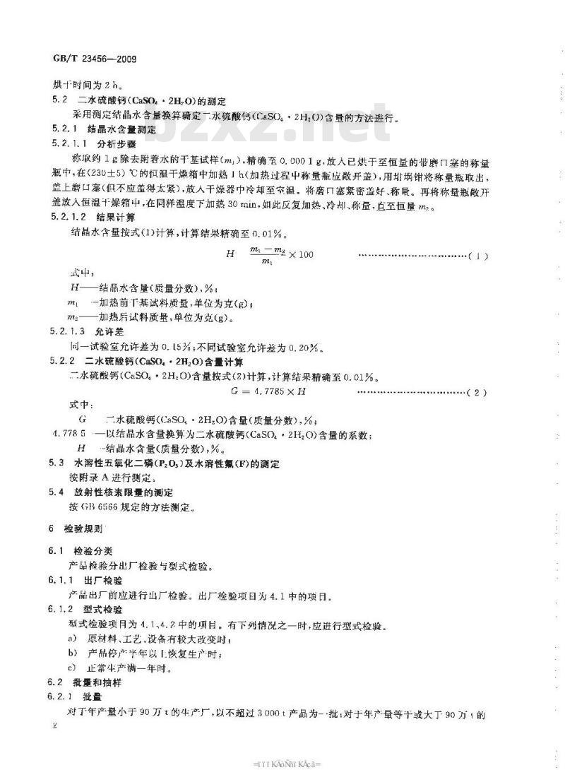同一试验室允许差为0.15%;不同试验室允许差为0.20%。5.2.2二水硫酸钙(CaSO),·2H,0)含量计算二水硫酸钙(CaSO。·2H,O)含量按式(2)计算,计算结果精确至0.01%。G=4.7785×H