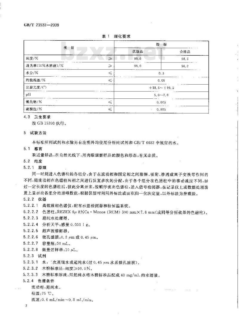 本标准规定了木糖的要求、试验方法、检验规则、标志、包装、运输、则存和保质期。本标准适用于以玉米芯等为原料,在硫酸催化剂存在的条件下经水解、脱色、净化、蒸发、结品、T燥等工艺加工生产的木糖的生产、检验与销售2规范性引用文件