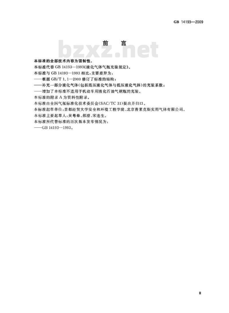 本标准代替GB14193—1993《液化气体气瓶充装规定》。本标准与GB14193—1993相比,主要差异为:根据GB/T1.1—2000修订了标准的结构;一补充一部分液化气体(包括高压液化气体与低压液化气体)的充装系数:一增加了本标准不适用于机动车用液化石油气钢瓶的充装。本标准的附录A为资料性附录。