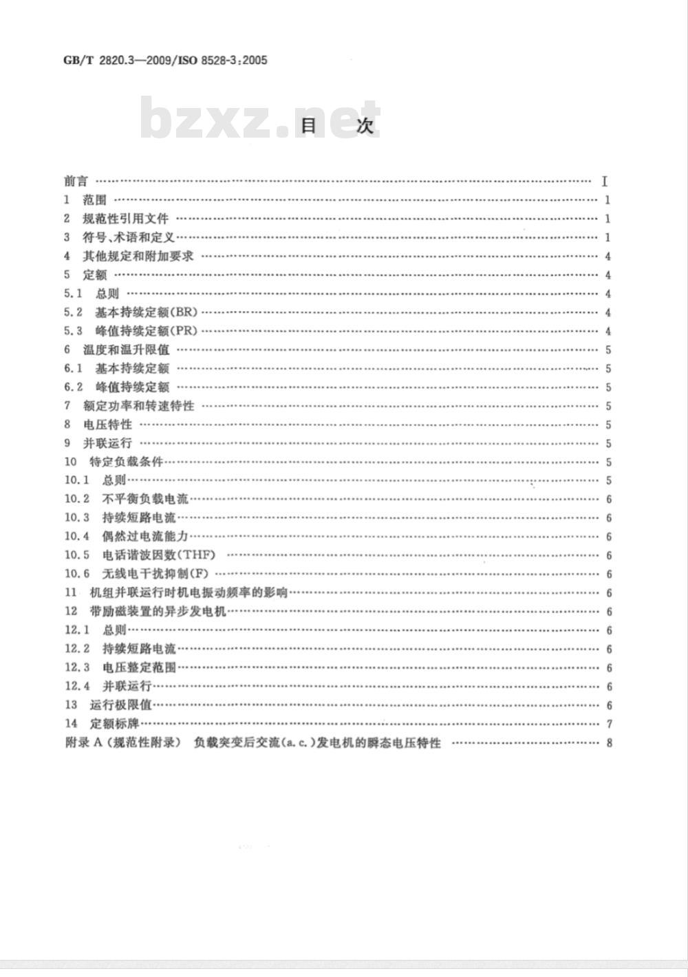 GB/T2820.3—2009/ISO8528-3:2005往复式内燃机驱动的交流发电机组第3部分:发电机组用交流发电机GB/T2820的本部分规定了发电机组用交流(a.c.)发电机在其电压调节器控制下的基本特性,是对GB755—2008有关要求的补充。注:目前尚无适用于异步发电机的国际标准。当这类标准出版后,本部分将相应予以修订。本部分适用于由往复式内燃(RIC)机驱动的陆用和船用交流(a.c.)发电机组用、但不适用于航空或驱动陆上车辆和机车的发电机组用交流(a.c.)发电机。对于某些特殊用途(例如医院、高层建筑必不可少的供电),附加要求可能是需要的。本部分的规定可作为确定任何附加要求的基础。对于由其他类型往复式原动机(例如蒸汽发动机)驱动的交流(a.c.)发电机组,本部分的规定可作为基础。