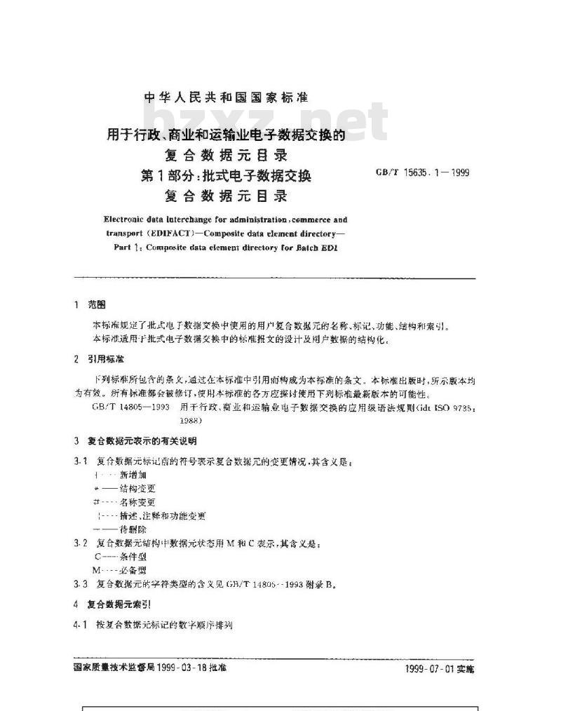 第1部分:批式电了数据交换复合数据元月录第2部分:交互式电子数据交换复台数据元目录本标准为第--次修订,GB/T 15635.【—1999与GB/T 15635-1995同时有效。本标准由中国标准化与息分类编码研究所提出并归口。本标准起草单位:中国标准化与信息分类编码研究所,本标准王要起草人;李颖,张荣静。W中华人民共和国国家标准