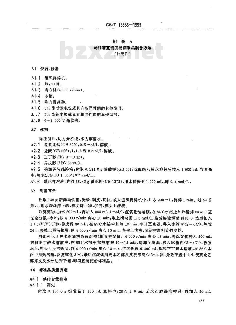 称取0.1000g标准品加入10mL0.5mol/L氢氧化钠溶液,在85℃水浴中加热分散,再加入21.5mL2mol/L盐酸溶液,在沸水浴中回流水解2h,用费林氏液法(见GB5513)测定还原糖,乘以0.9系数,即得淀粉含量,计算标准品淀粉含量。A4.4马铃薯直链淀粉标准品标准马铃薯直链淀粉标准品必须具备:a.碘结合量在19%~20%之间,
