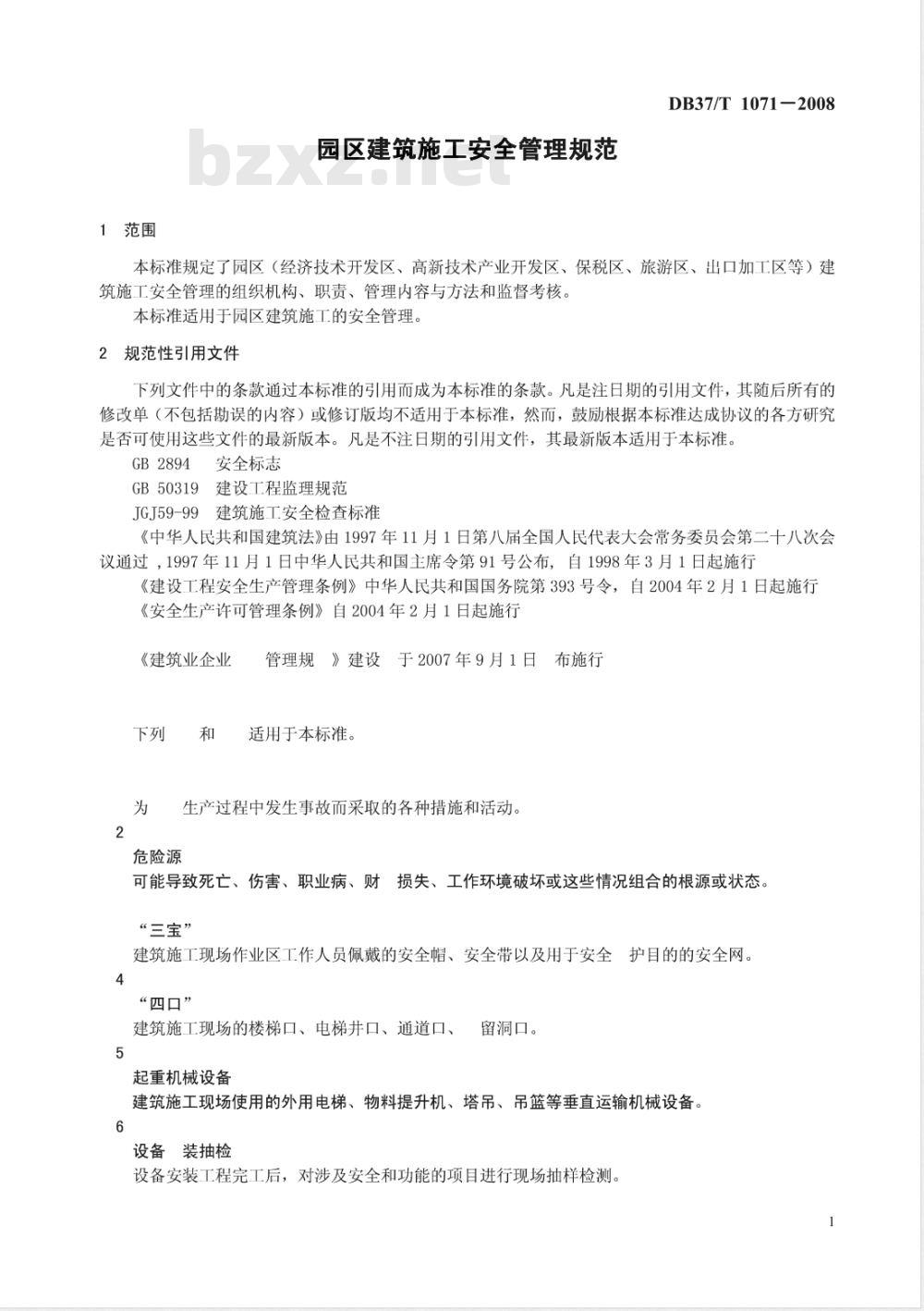 本标准规定了园区(经济技术开发区、高新技术产业开发区、保税区、旅游区、出口加工区等)建筑施工安全管理的组织机构、职责、管理内容与方法和监督考核。本标准适用于园区建筑施工的安全管理。2规范性引用文件