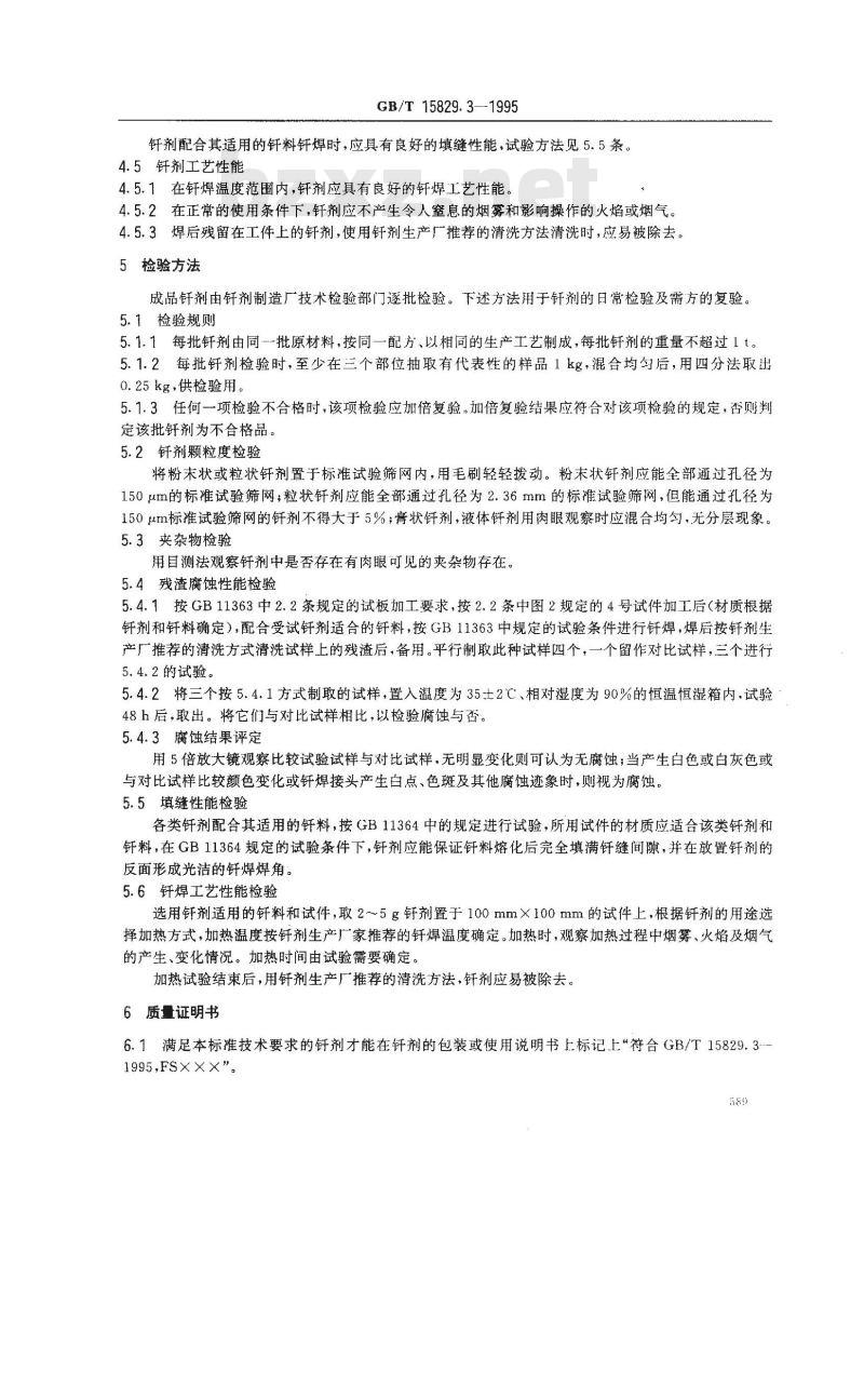 6.1满足本标准技术要求的钎剂才能在钎剂的包装或使用说明书上标记上“符合GB/T15829.31995,FSXXX\