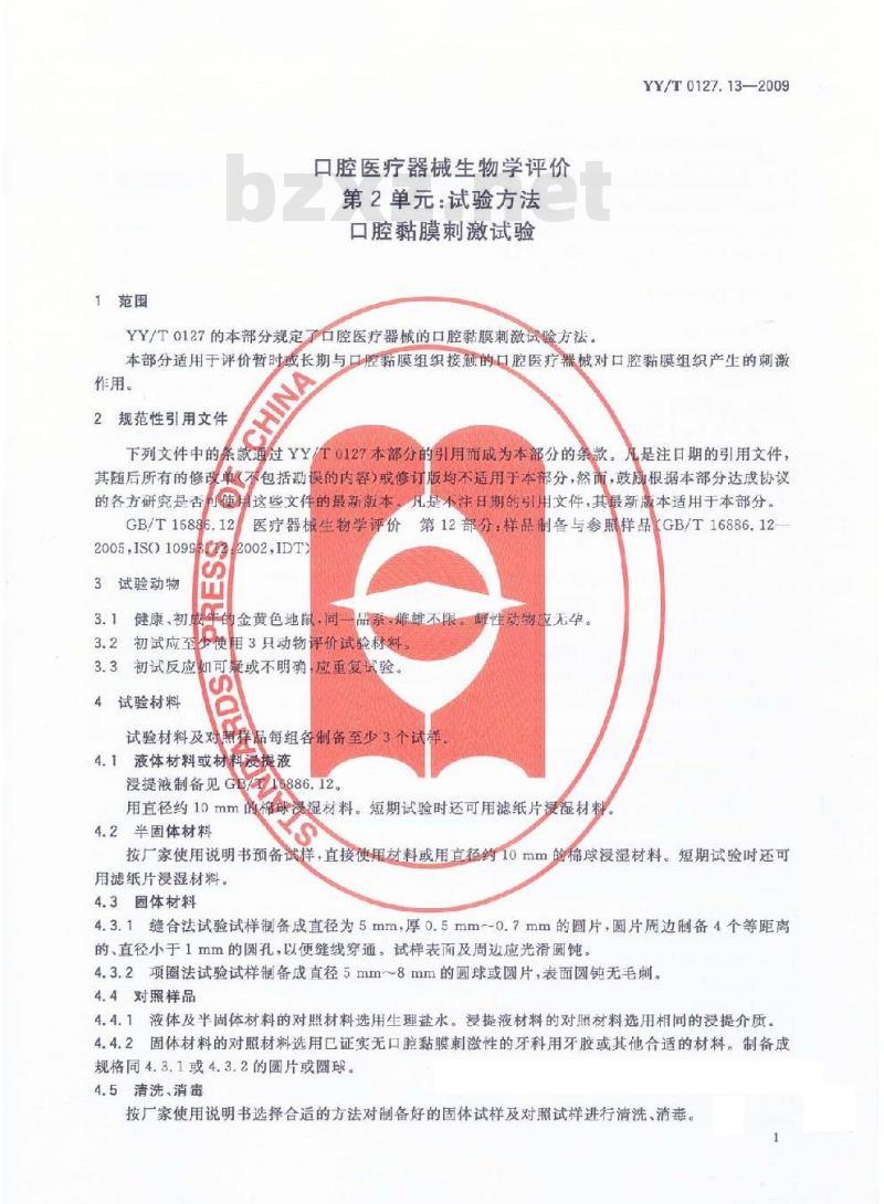 - YY/T 0127.13-2009 口腔医疗器械生物学评价 第2单元:试验方法 口腔粘膜刺激试验