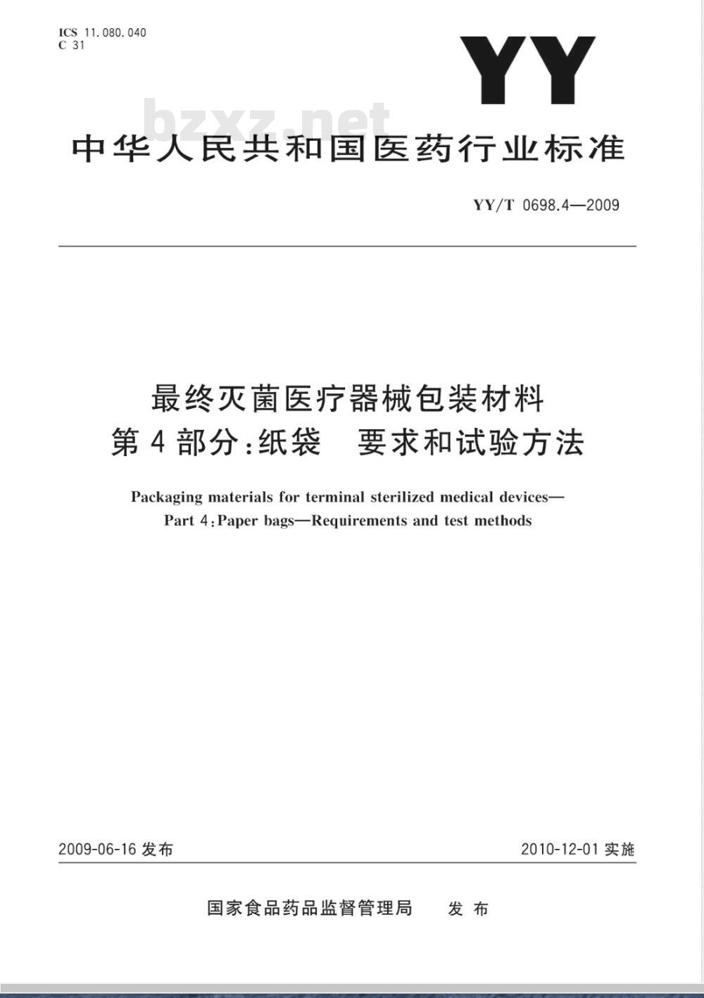- YY/T 0698.4-2009 最终灭菌医疗器械包装材料 第4部分:纸袋 要求和试验方法