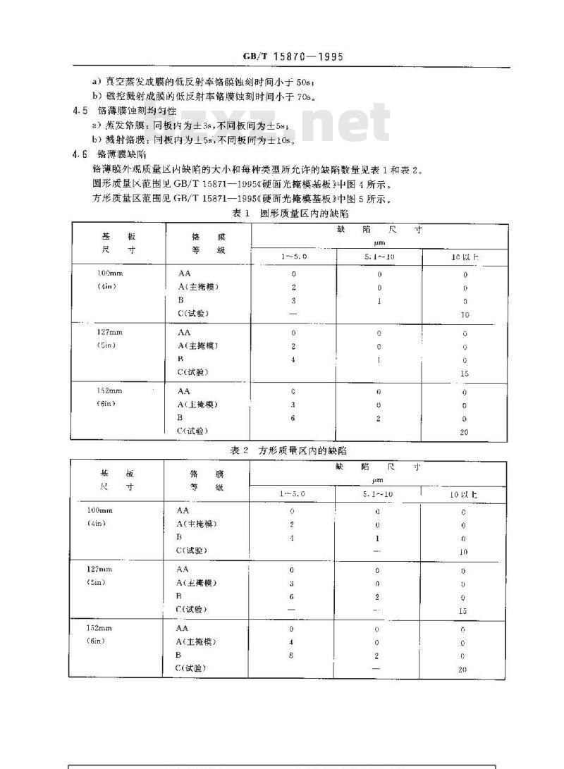 铬薄膜外观质量区内缺陷的大小和每种类型所允许的缺陷数量现表1和表2。圆形质量区范围见GB/T15871—19956硬面光掩模基板\中图4所示。方形质量区范围见(FB/T15871—1995《硬面光掩模基板》中图5所示,表1圆形质量区内的缺陷