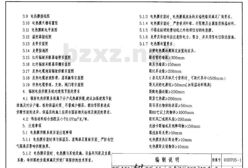本图集适用于工业与民用项目~220/380V50Hz供电系统中应用电热膜供暖、自控电伴热、发热电缆低温辐射及电热红外采暖器供暖系统电气部分的设计安装,3.图集内容