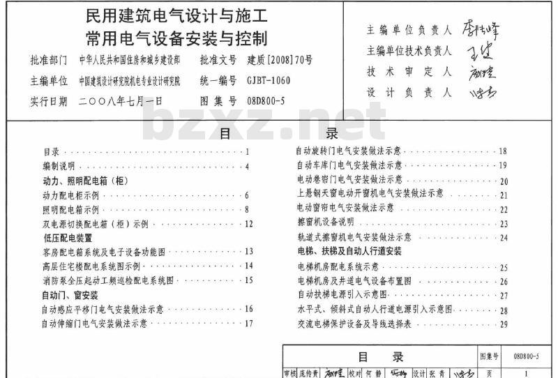 (新编)。配电箱(柜)设计与安装;自动门、窗电气安装;电梯、扶梯及自动人行道电气安装;升降类停车设备电气安装、常用低压配电设备安装;常用风机、常用水泵控制;其他特种常用电机控制等。 08D800-5 民用建筑电气设计与施工 中册(2008年合订本)D800-4~5 08D800-5