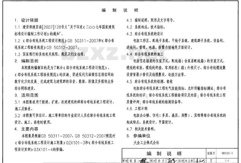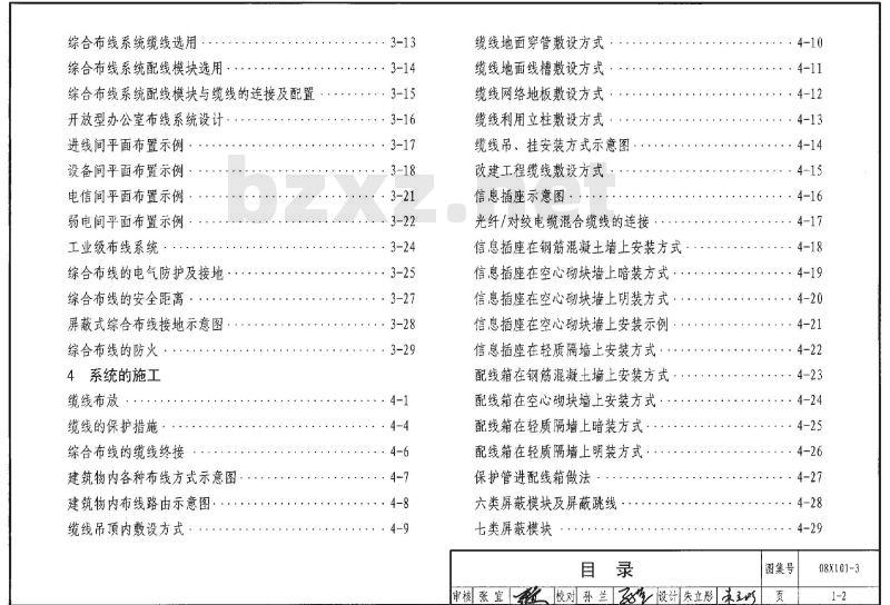 图形及文字符号、系统构成、技术指标、系统的设计与配置、系统的设备安装、缆线敷设、检测、验收、工程示例、相关技术资料。 08X101-3 综合布线系统工程设计与施工 08X101-3