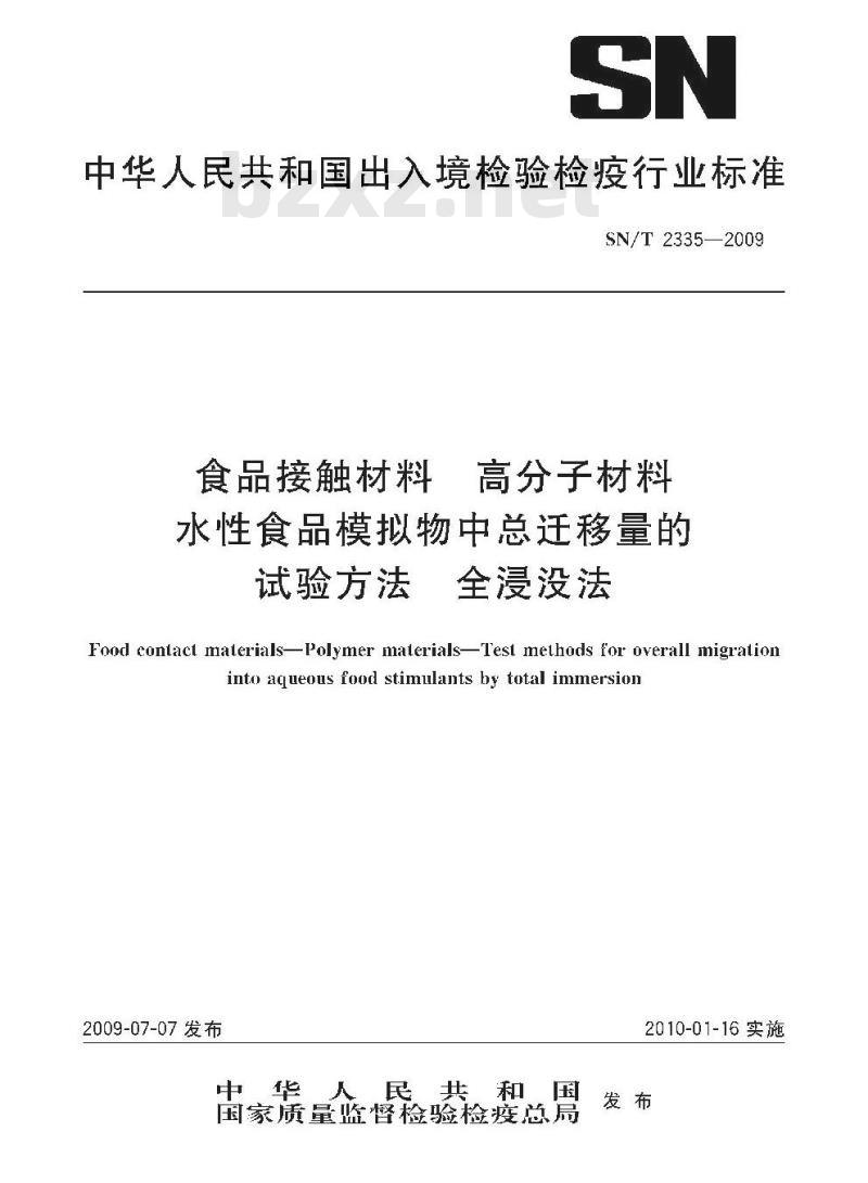 SN/T 2335-2009 食品接触材料 高分子材料 水性食品模拟物中总迁移量的试验方法 全浸没法 SN/T2335-2009
