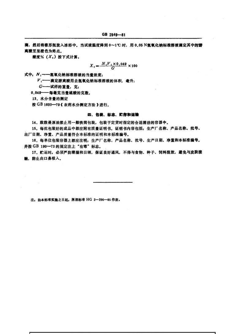 4。每批出厂的敌敌畏原油应附有质量证明书,其内容包括:生产厂名称、产品名称、生产日期、批号、净重、标准编号及使用说明,注明最小包装,并按GB190一73的规定注上有毒”标志。5.每批敌敌畏原油的量不超过包装前贮罐的容量。6使用单位有权按照本标准的各项规定对所收到的敌敌畏原油的质量进行核验。核验其指标是否符合本标准的要求。