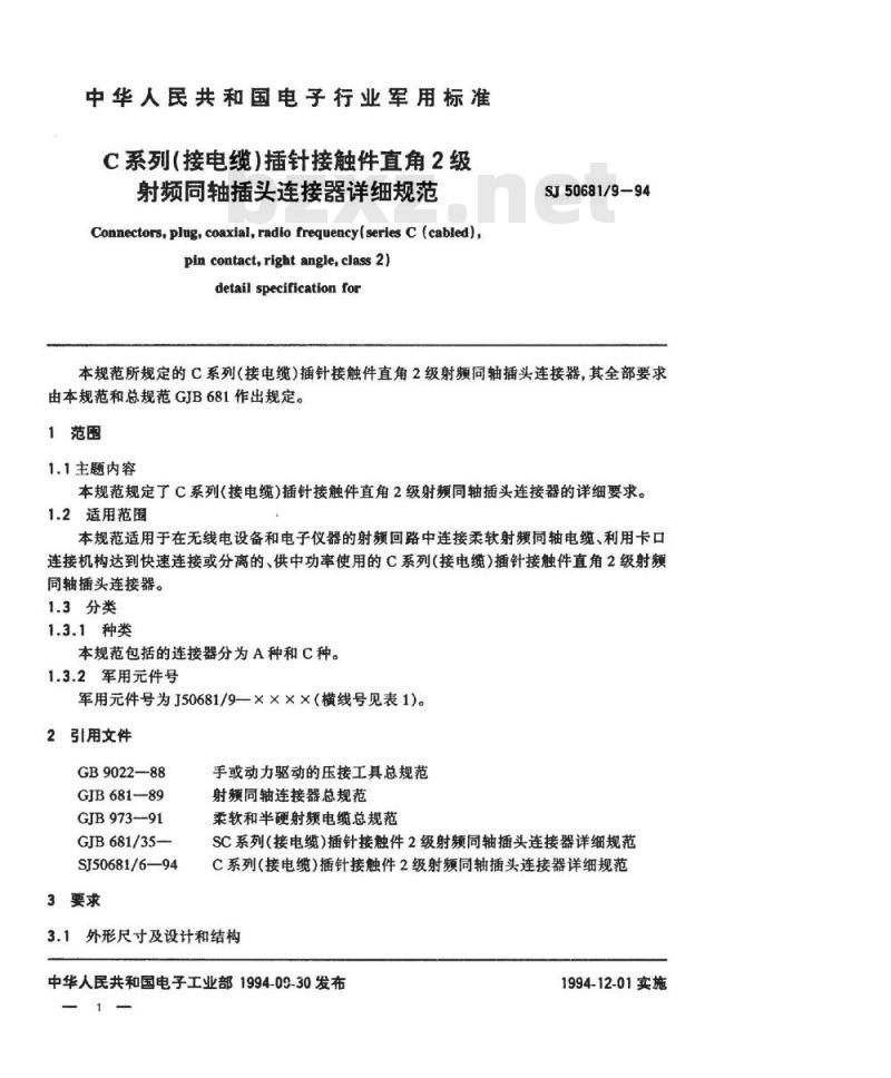 - SJ 50681.9-1994 C系列(接电缆)插针接触件直角2级射频同轴插头连接器详细规范