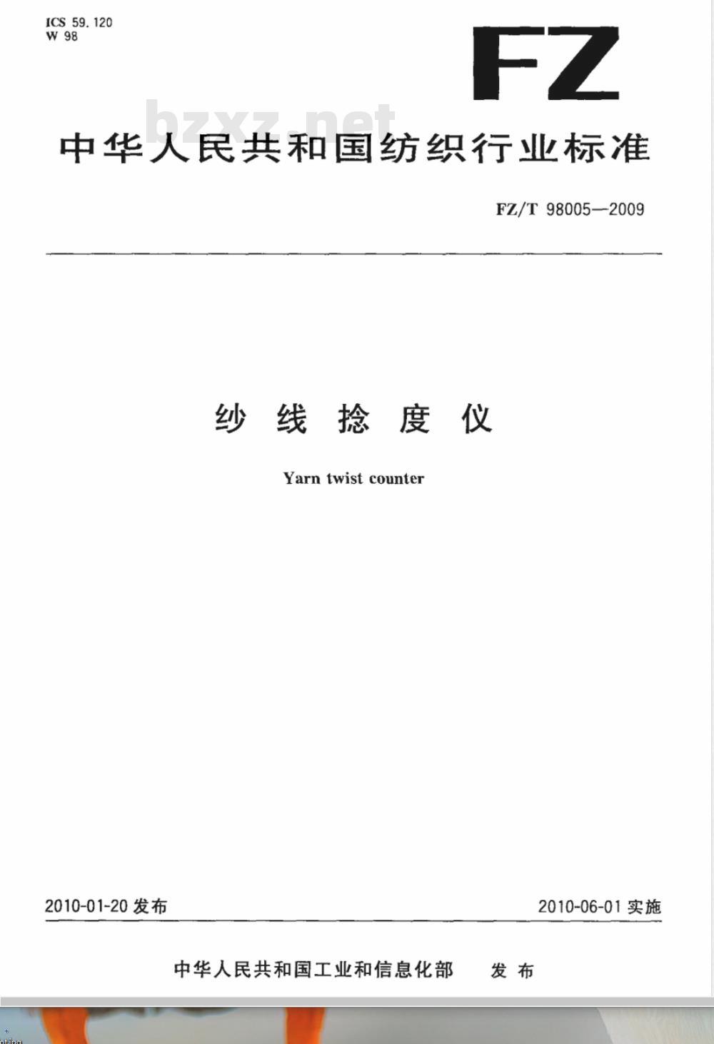 本标准规定了纱线捻度仪的基本功能和要求、试验方法、检验规则及标志、包装、运输和贮存。本标准适用于直接计数法、退捻加捻法测量纱线捻度的捻度仪。本标准不适用于手摇纱线捻度仪。 FZ/T 98005-2009 纱线捻度仪 FZ/T98005-2009