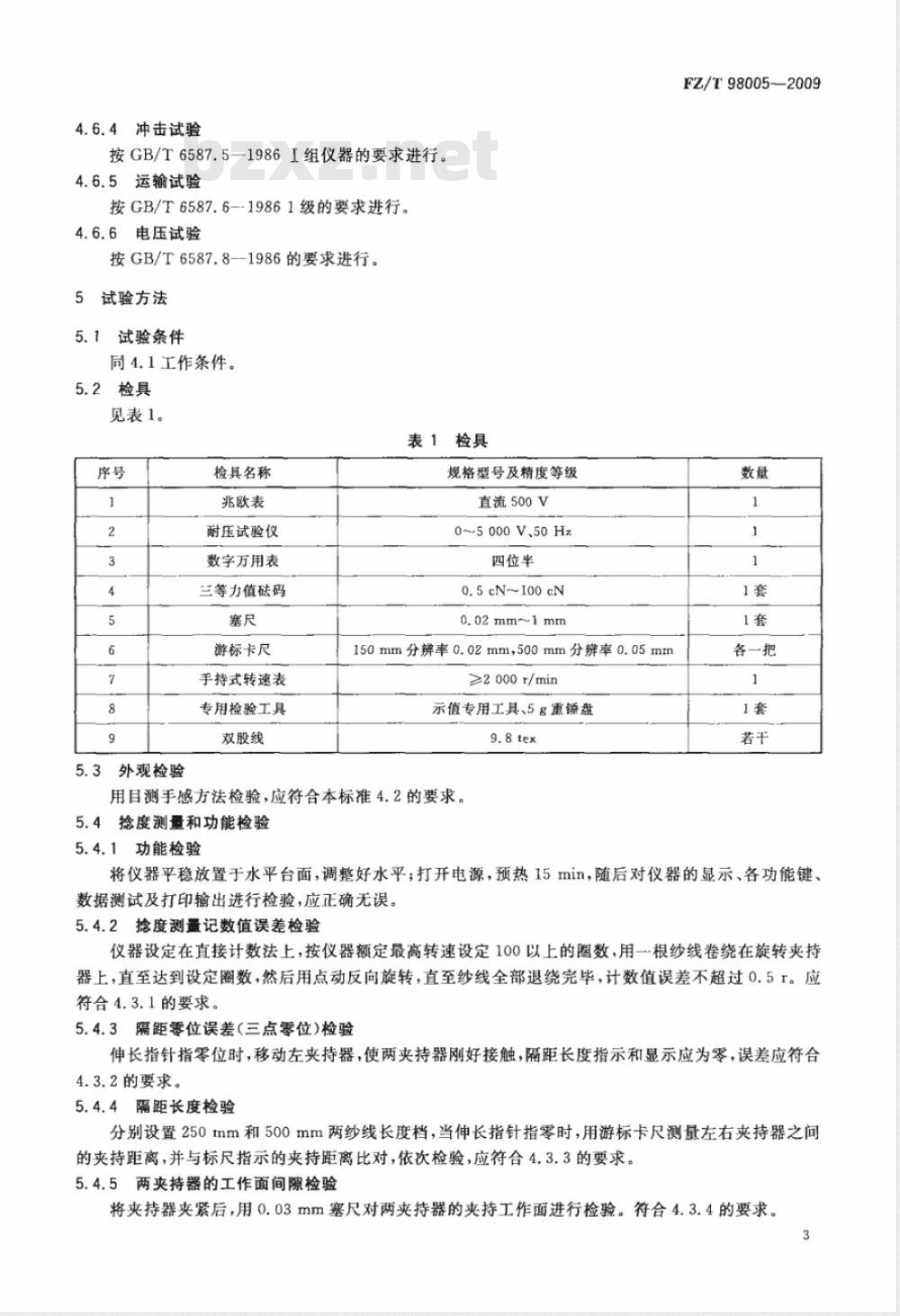 4.3.1捻回数记数值误差:士0.5r。4.3.2隔距零位误差(三点零位):≤0.5mm。4.3.3隔距长度误差:±0.5mm。4.3.4夹持器工作面间隙:≤0.03mm。4.3.5旋转夹持器偏心量:≤0.25mm。4.3.6