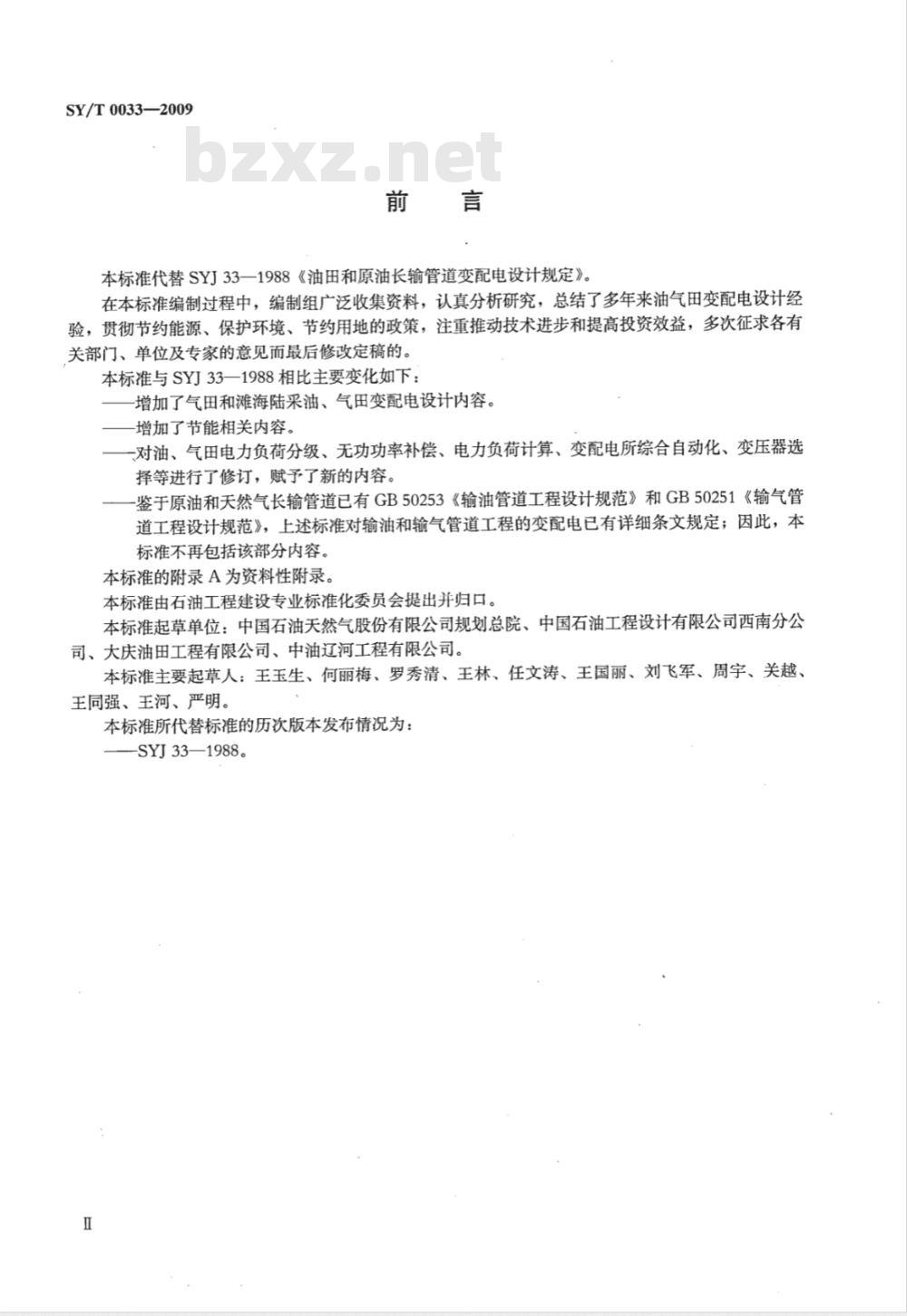 本标准代替SYJ33—1988《油田和原油长输管道变配电设计规定》。在本标准编制过程中,编制组广泛收集资料,认真分析研究,总结了多年来油气田变配电设计经验,贯彻节约能源、保护环境、节约用地的政策,注重推动技术进步和提高投资效益,多次征求各有关部门、单位及专家的意见而最后修改定稿的。本标准与SYJ33—1988相比主要变化如下:增加了气田和滩海陆采油、气田变配电设计内容。增加了节能相关内容。
