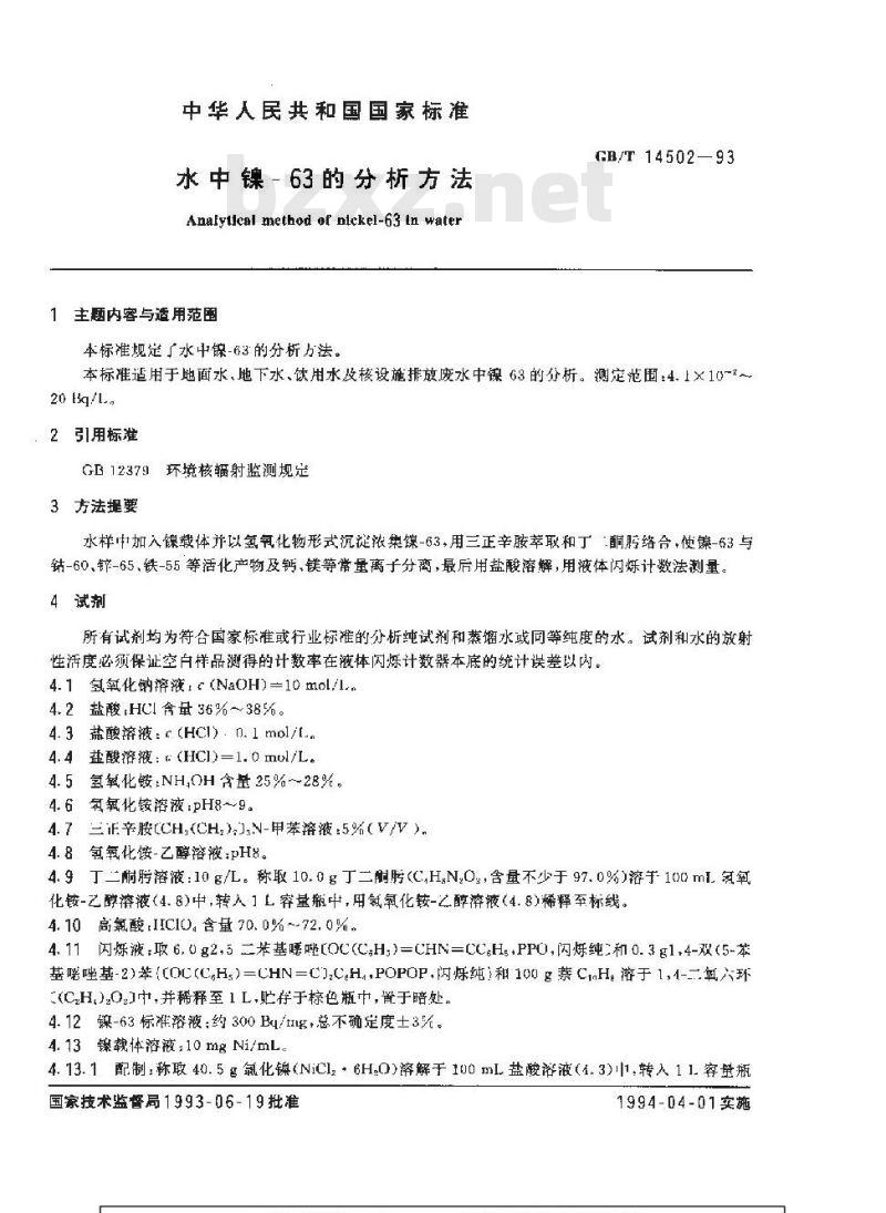 本标准规定了水中镍-63的分析方法。GB/T14502—93