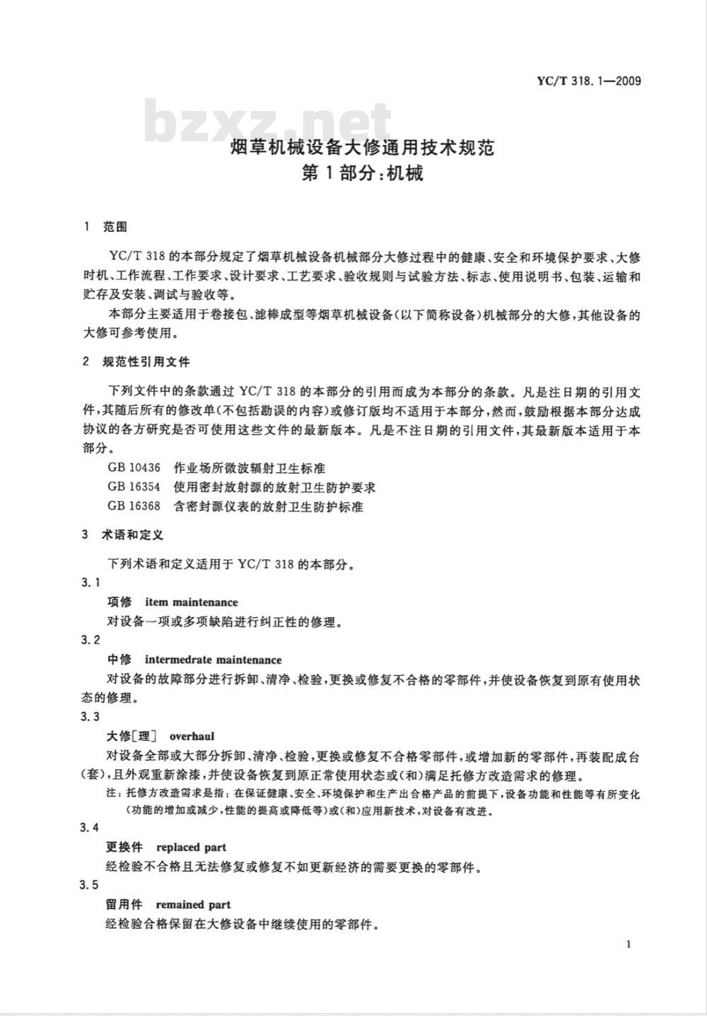 YC/T318《烟草机械设备大修通用技术规范》分为两部分:一第1部分:机械;