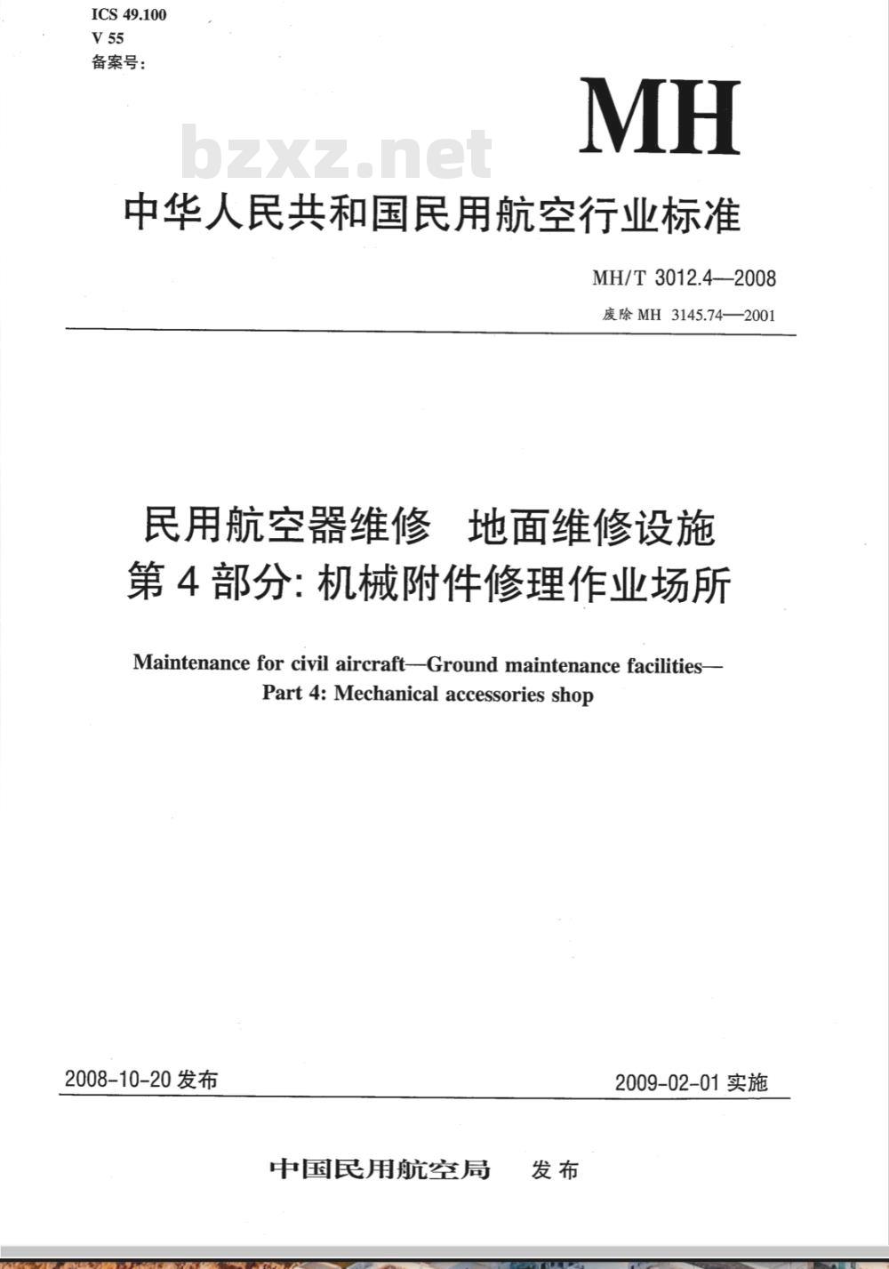 - MH/T 3012.4-2008 民用航空器维修标准 地面维修设施 第4部分:机械附件修理作业场所