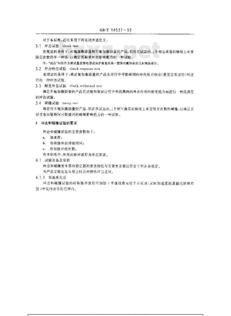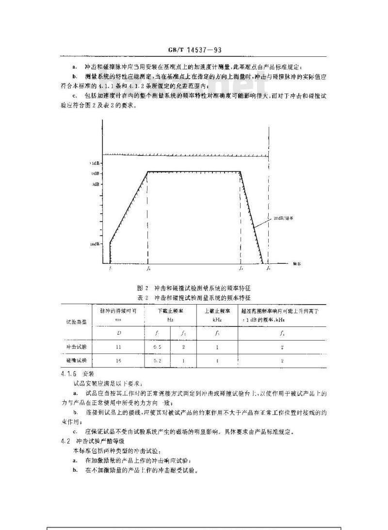 谢受冲山试验的加速度峰值,按装1所规定的严酷等级选择,4.6.2碰撤试验应当依次在被试产品的三个相互垂直的每-个线的每个方向(即上、下,前、后、左、在)各加 1 000 个陈冲(共计 6 000 个脉冲)。碰撞试验的如速度峰值,按表5所规定的严酷等级选揉。GB/T 14537--93Www.bzxZ.net
