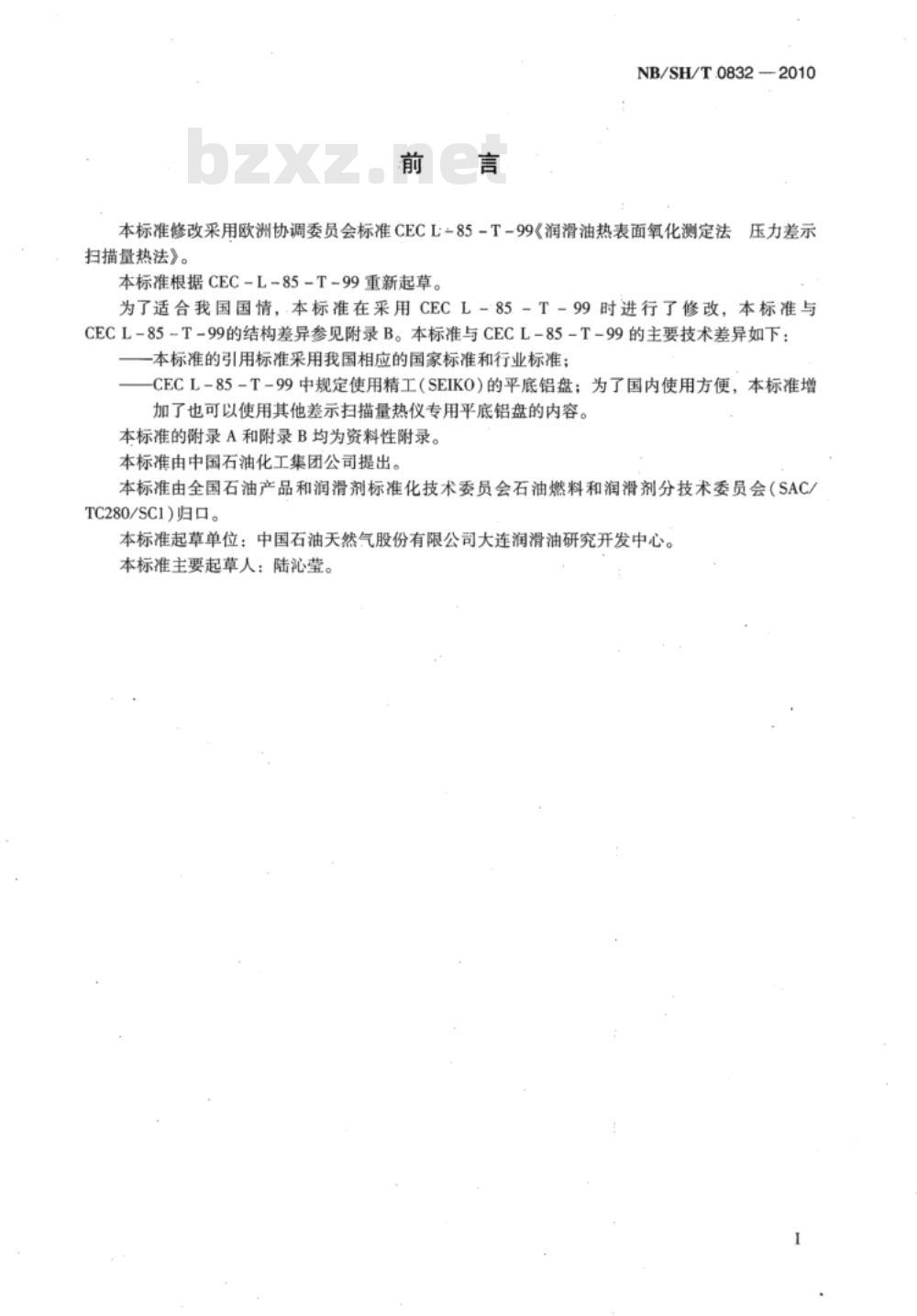 本标准根据CEC-L-85-T-99重新起草。为了适合我国国情,本标准在采用CECL-85-T-99时进行了修改,本标准与CECL-85-T-99的结构差异参见附录B。本标准与CECL-85-T-99的主要技术差异如下:本标准的引用标准采用我国相应的国家标准和行业标准;CECL-85-T-99中规定使用精工(SEIKO)的平底铝盘;为了国内使用方便,本标准增加了也可以使用其他差示扫描量热仪专用平底铝盘的内容。本标准的附录A和附录B均为资料性附录。本标准由中国石油化工集团公司提出。本标准由全国石油产品和润滑剂标准化技术委员会石油燃料和润滑剂分技术委员会(SAC/TC280/SC1)归口。
