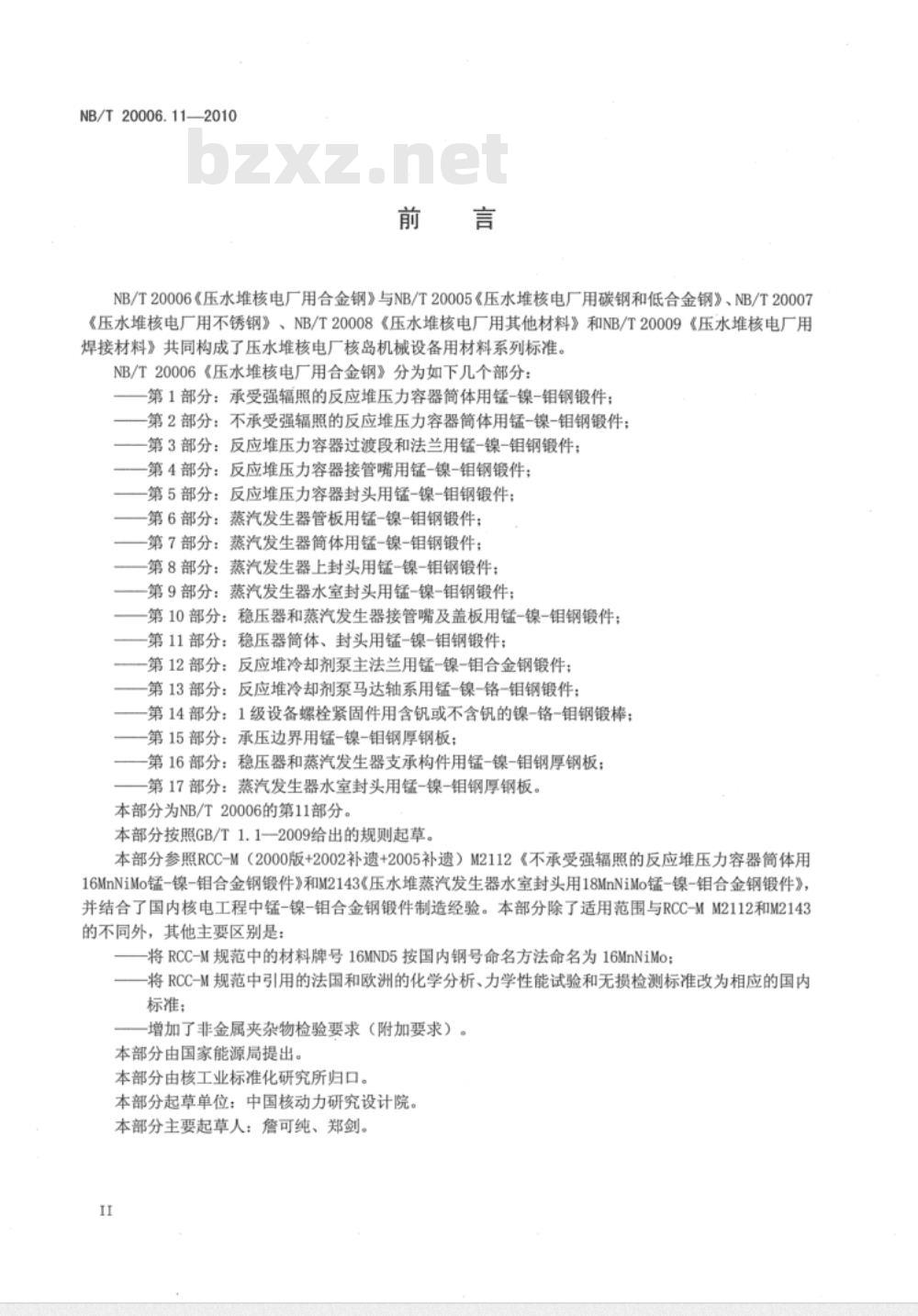 NB/T20006《压水堆核电厂用合金钢》与NB/T20005《压水堆核电厂用碳钢和低合金钢》、NB/T20007《压水堆核电厂用不锈钢》、NB/T20008《压水堆核电厂用其他材料》和NB/T20009《压水堆核电厂用焊接材料》共同构成了压水堆核电厂核岛机械设备用材料系列标准。NB/T20006《压水堆核电厂用合金钢》分为如下几个部分:第1部分:承受强辐照的反应堆压力容器筒体用锰-镍-钼钢锻件;第2部分:不承受强辐照的反应堆压力容器筒体用锰-镍-钼钢锻件;第3部分:反应堆压力容器过渡段和法兰用锰-镍-钼钢锻件;第4部分:反应堆压力容器接管嘴用锰-镍-钼钢锻件;第5部分:反应堆压力容器封头用锰-镍-钼钢锻件;第6部分:蒸汽发生器管板用锰-镍-钼钢锻件:第7部分:蒸汽发生器筒体用锰-镍-钼钢锻件:第8部分:蒸汽发生器上封头用锰-镍-钼钢锻件:第9部分:蒸汽发生器水室封头用锰-镍-钼钢锻件;第10部分:稳压器和蒸汽发生器接管嘴及盖板用锰-镍-钼钢锻件;第11部分:稳压器筒体、封头用锰-镍-钼钢锻件;第12部分:反应堆冷却剂泵主法兰用锰-镍-钼合金钢锻件;第13部分:反应堆冷却剂泵马达轴系用锰-镍-铬-钼钢锻件:第14部分:1级设备螺栓紧固件用含钒或不含钒的镍-铬-钼钢锻棒;第15部分:承压边界用锰-镍-钼钢厚钢板;第16部分:稳压器和蒸汽发生器支承构件用锰-镍-钼钢厚钢板;第17部分:蒸汽发生器水室封头用锰-镍-钼钢厚钢板。本部分为NB/T20006的第11部分。本部分按照GB/T1.1-2009给出的规则起草。本部分参照RCC-M(2000版+2002补遗+2005补遗)M2112《不承受强辐照的反应堆压力容器筒体用16MnNiMo锰-镍-钼合金钢锻件》和M2143《压水堆蒸汽发生器水室封头用18MnNiMo锰-镍-钼合金钢锻件》,并结合了国内核电工程中锰-镍-钼合金钢锻件制造经验。本部分除了适用范围与RCC-MM2112和M2143的不同外,其他主要区别是:
