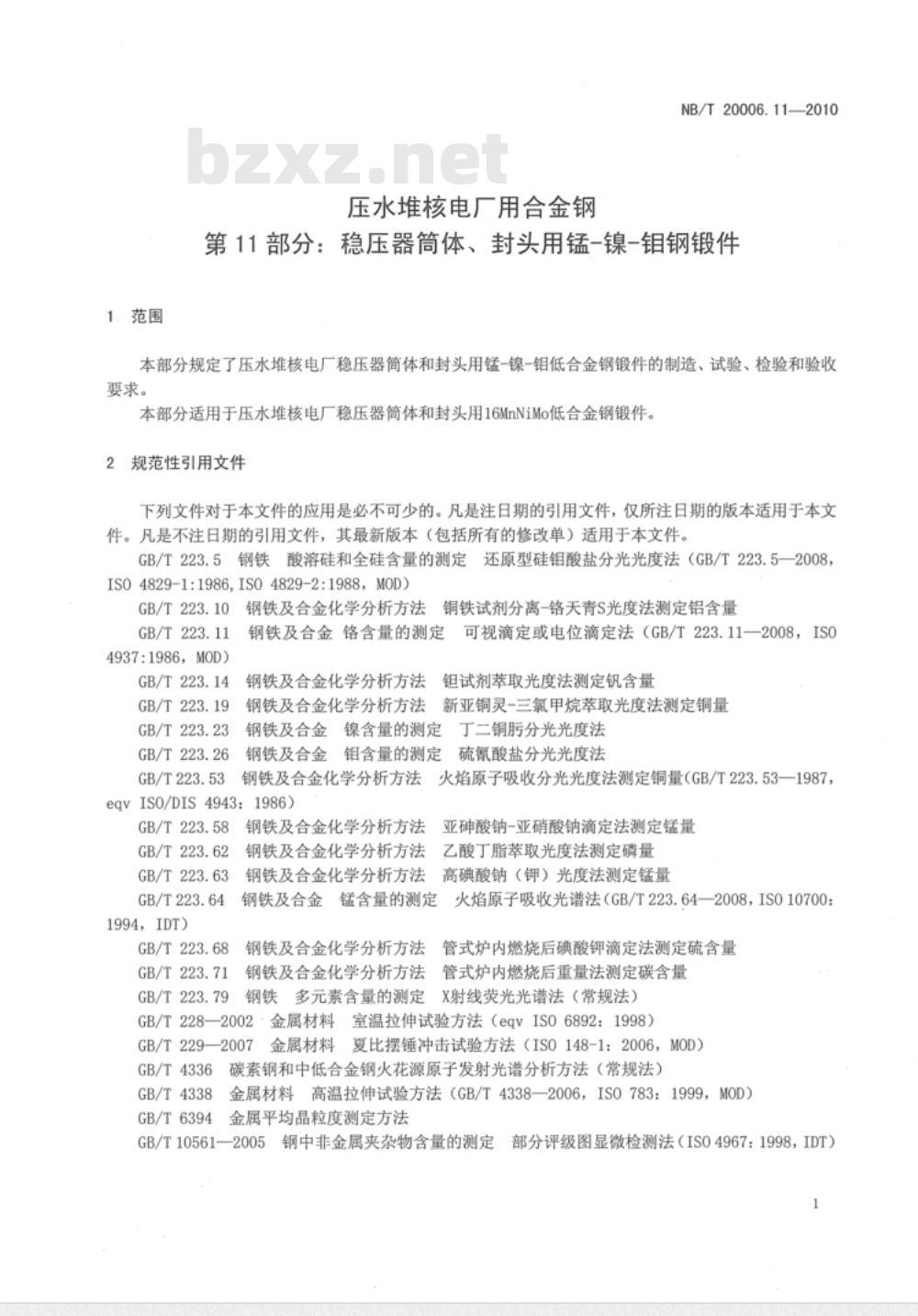 Alloy steelfor pressurized water reactornuclear power plants-Part 1l: Mn-Ni-Mo steel forgings for pressurizer shells and heads2010-05-01发布