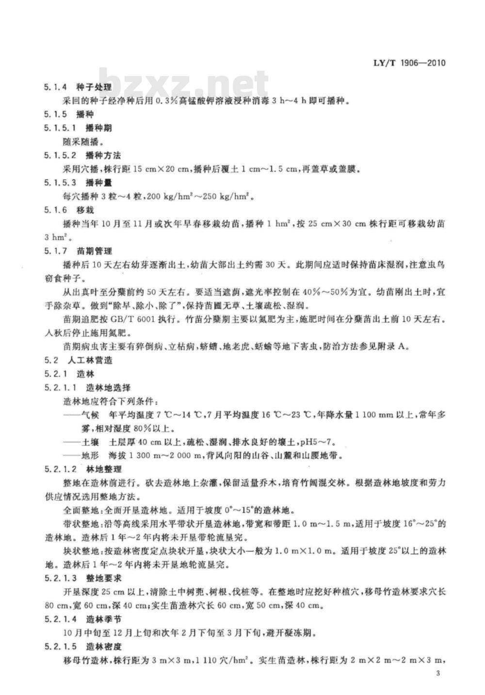 造林时应配置适生阔叶乔木树种,或保留现有林地内的乔木树种,形成上层乔木郁闭度0.30.4。5.2.1.7竹苗规格