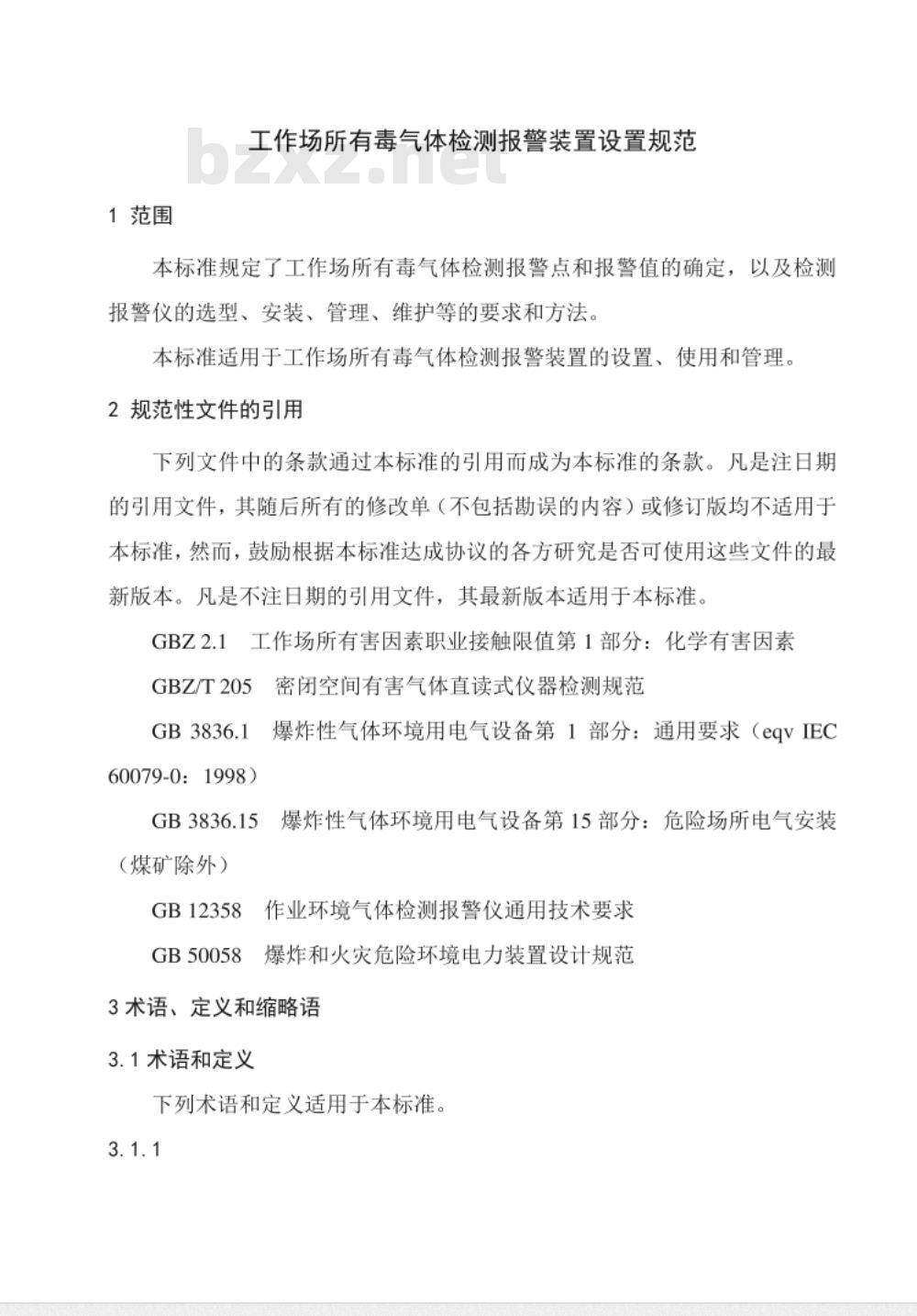 工作场所有毒气体检测报警装置设置规范本标准规定了工作场所有毒气体检测报警点和报警值的确定,以及检测报警仪的选型、安装、管理、维护等的要求和方法。本标准适用于工作场所有毒气体检测报警装置的设置、使用和管理。2规范性文件的引用