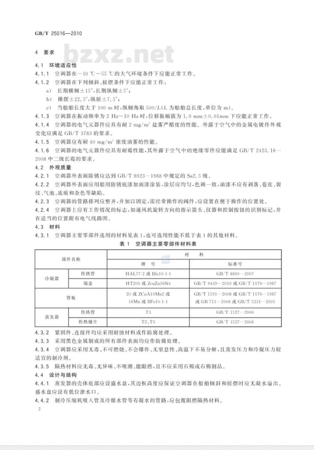 当船舶长度大于100m时,纵倾角取500/L(L为船舶总长度,单位为m)。空调器在振动频率为2Hz10Hz时.位移振幅值为1.0mm士0.01mm下应能正常工作。空调器的电气元器件应具有耐2mg/m盐雾严酷度的性能。外露于空气中的金属电镀件外观变化应满足GB/T3783的要求,