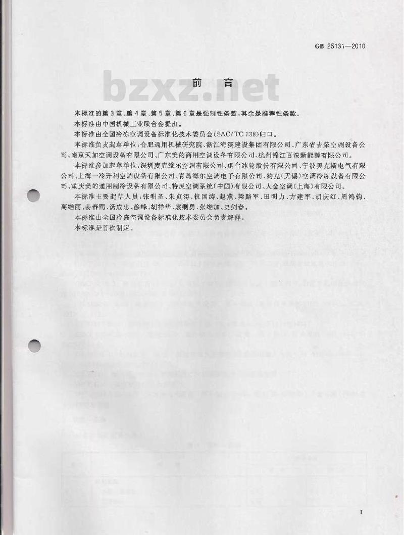 本标准的第 3 章、第 4 章,第 5 章,第6章是强制性条款,其余是推荐性条款。本标准出中国机械工业联合会提出。本标准出全国冷冻空调设备标准化技术委员会(S.AC/TC238)归口。GB25131—2010