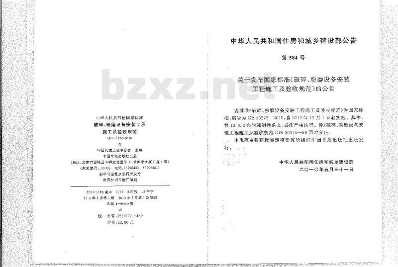 现批准《被碎、粉磨设备安装工程施工及验收规范》为国家标,编号为GB50275-2010,自201C年12月1日起实施。其中,第13.0.2条为强制性条文,必须严格执行。原破碎、粉磨设备安装工程施三及验改规范》GH50276—98同对废止。本规范由我部标定额研究所组织中国习划出版社出版发行。