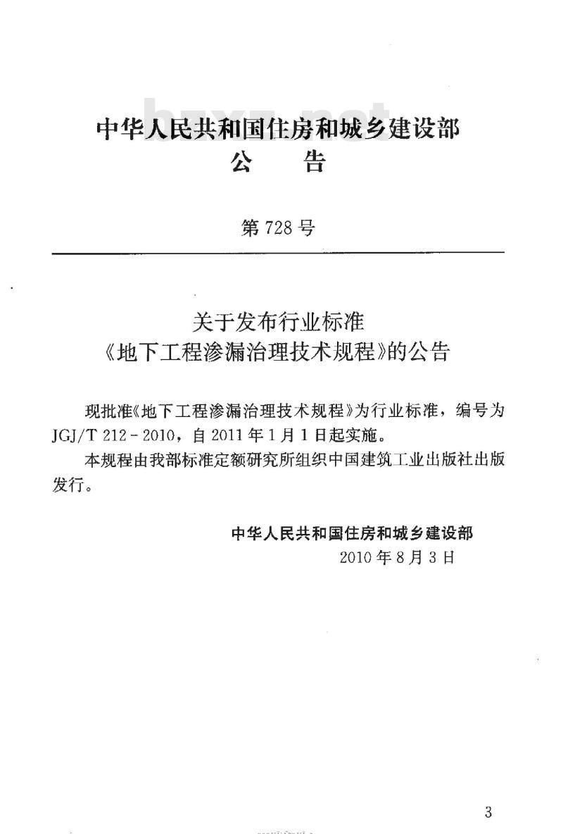 《地下工程渗漏治理技术规程》的公告现批准《地下工程渗漏治理技术规程》为行业标准,编号为JGJ/T212-2010,自2011年1月1日起实施。本规程由我部标准定额研究所组织中国建筑工业出版社出版发行。