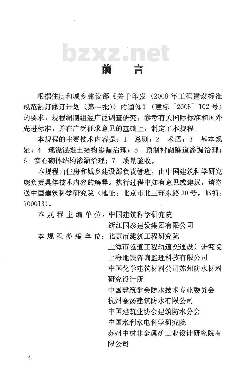 根据住房和城乡建设部《关于印发<2008年工程建设标准规范制订修订计划(第一批))的通知》(建标「2008102号)的要求,规程编制组经广泛调香研究,参考有关国际标准和国外先进标准,并在广泛征求意见的基础上,制定广本规程。本规程的主要技术内容是:1总则;2术语;3基本规定;4现浇混凝土结构渗漏治理:5预制衬砌隧道渗漏治理6实心砌体结构渗漏治理;7质量验收。本规程由住房和城乡建设部负责管理,由中国建筑科学研究院负责具体技术内容的解释。执行过程中如有意见或建议,请寄送中国建筑科学研究院(地址:北京市北三环东路30号,邮编:100013)。
