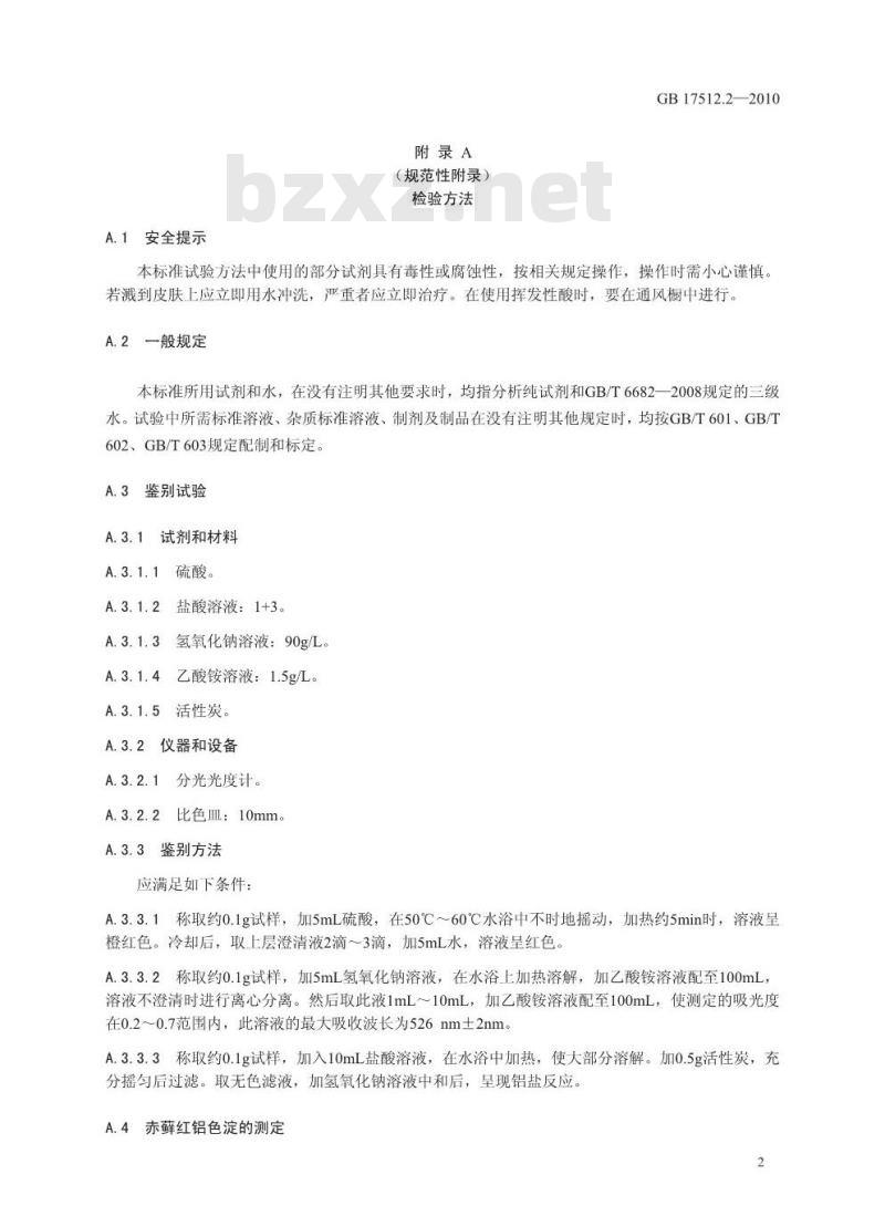 本标准所用试剂和水,在没有注明其他要求时,均指分析纯试剂和GB/T6682一2008规定的三级水。试验中所需标准溶液、杂质标准溶液、制剂及制品在没有注明其他规定时,均按GB/T601、GB/T602、GB/T603规定配制和标定。A.3鉴别试验