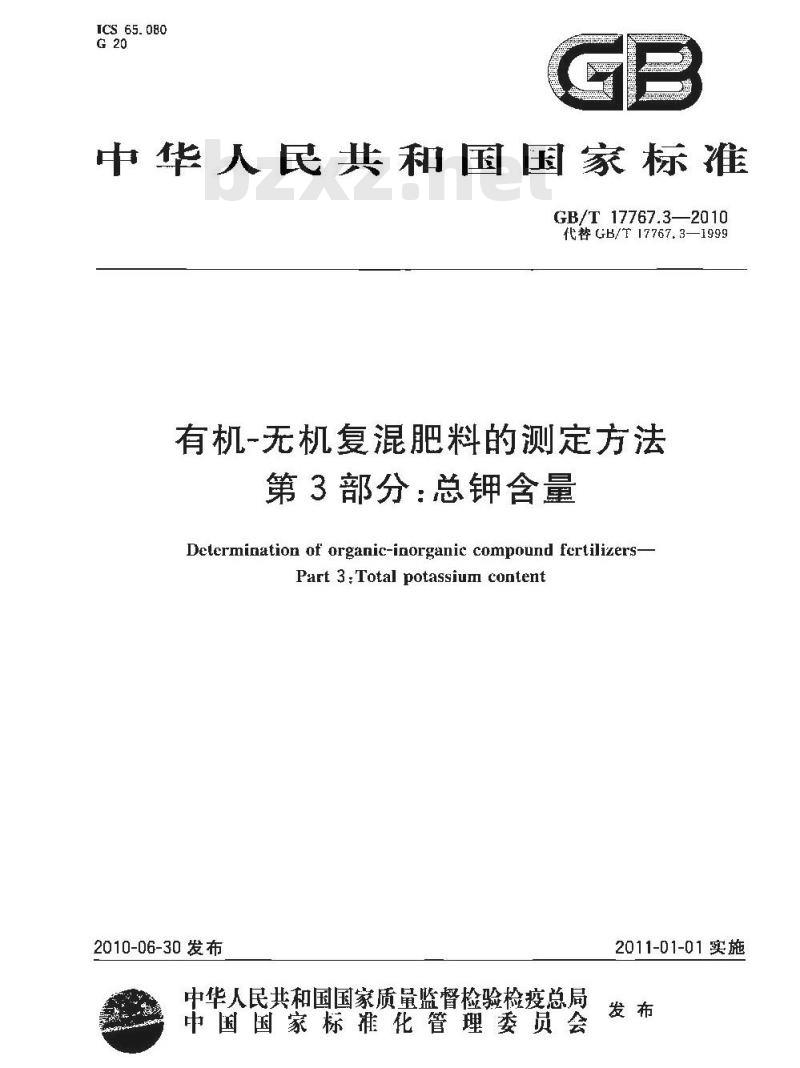 GB/T17767的本部分规定了有机无机复混肥料中总钾含量的测定方法,GB/T 17767.3—2010