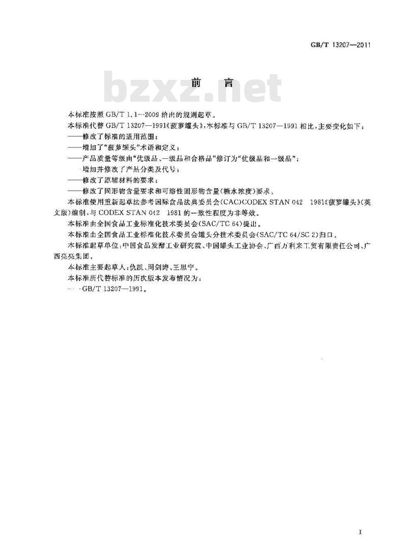 修改了周形物含量要求和可溶性固形物含量(糖水浓度)要求,本标准使用重新起草法参考国际食品法典委员会(CAC)CODEXSTAN0421981被萝罐头》(英文版)编制,与CODEXSIAN0421981的一致性程度为非等效。本标准由全国食品工业标准化技术委员会(SAC/TC64)提出。本标准由全国食品工业标准化技术委员会罐头分技术委员会(SAC/TC64/SC2)归口。本标推起草单位:中国食品发酵工业研究院、中国罐头工业协会,广西方利来工贸有限责任公司、广西弦芜集团: