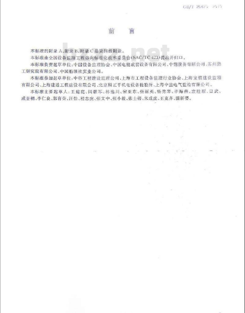 本标准参加起草单位:中咨工程建设监理公司、上海市工程设备监理行业协会、上海宝钢建设监理有限公司、上海建通工程建设有限公司、北京科正平机电设备检验所、上海中监电气监检有限公司。