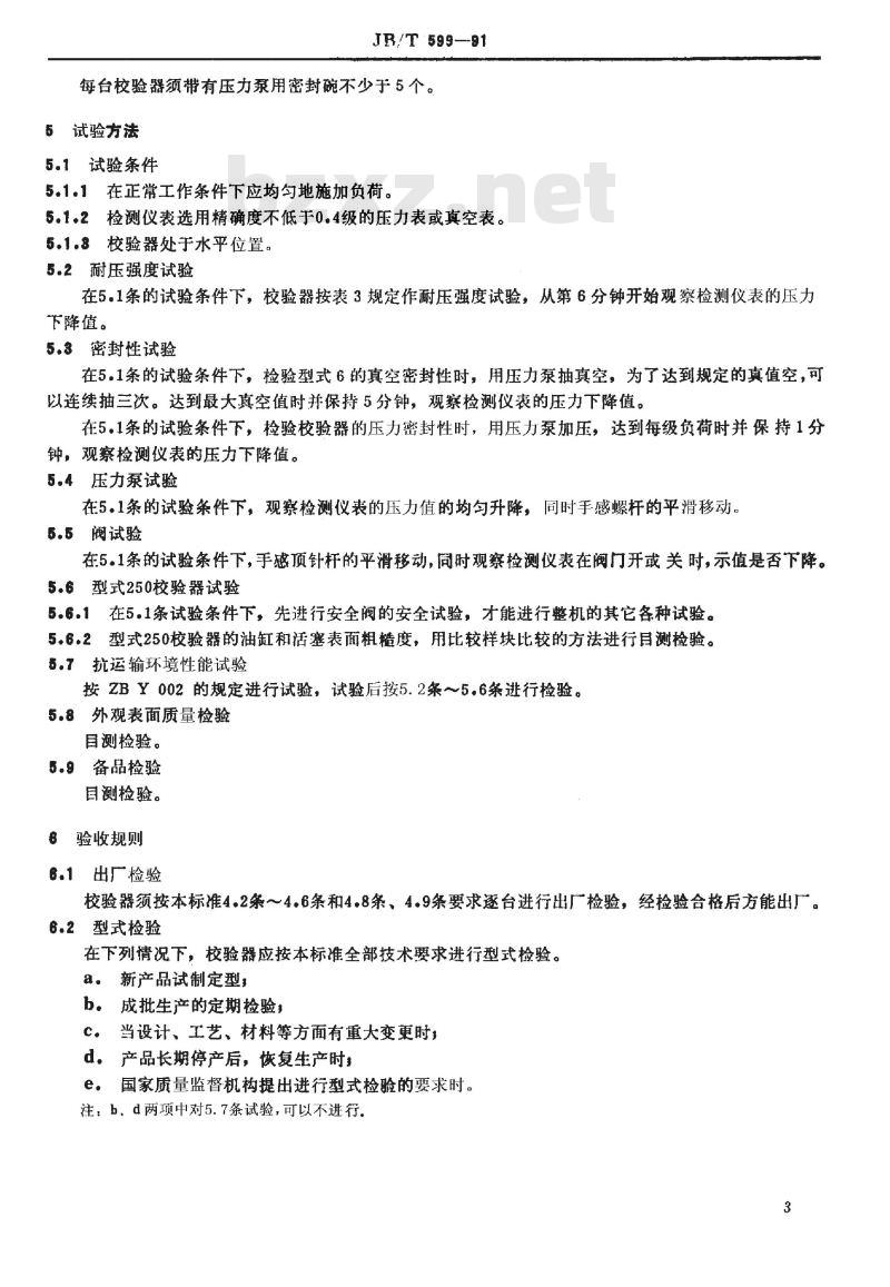 在5.1条的试验条件下,检验型式6的真空密封性时,用压力泵抽真空,为了达到规定的真值空,可以连续抽三次。达到最大真空值时并保持5分钟,观察检测仪表的压力下降值。在5.1条的试验条件下,检验校验器的压力密封性时,用压力泵加压,达到每级负荷时并保持1分钟,观察检测仪表的压力下降值。5.4压力泵试验