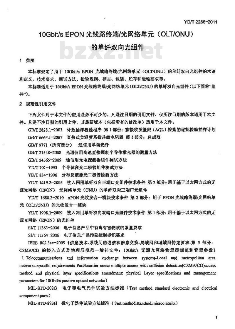 本标准规定了用于1OGbit/sEPON光线路终端/光网络单元(OLT/ONU)的单纤双向光组件的术语和定义、技术要求、测试方法、检验规则、标志、包装、贮存和运输要求等,本标准适用于10Gbit/sEPON光线路终端/光网络单元(OLT/ONU)的单纤双向光组件(以下简称“组件”。