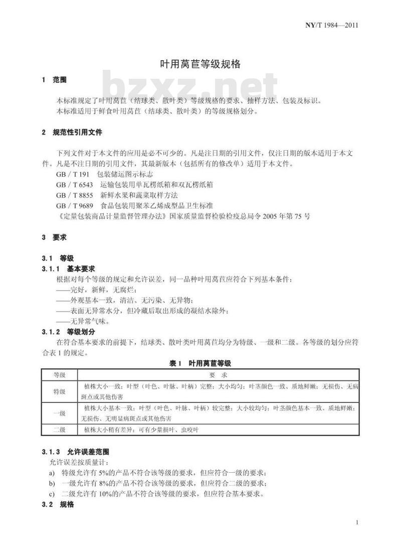 本标准规定了叶用莴苣(结球类、散叶类)等级规格的要求、抽样方法、包装及标识。本标准适用于鲜食叶用葛苣(结球类、散叶类)的等级规格划分。2规范性引用文件