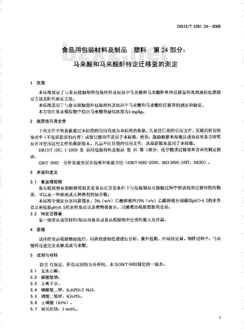 DB13/T 1081.24-2009 食品用包装材料及制品 塑料 第24部分:马来酸和马来酸酐特定迁移量的测定 DB13/T1081.24-2009