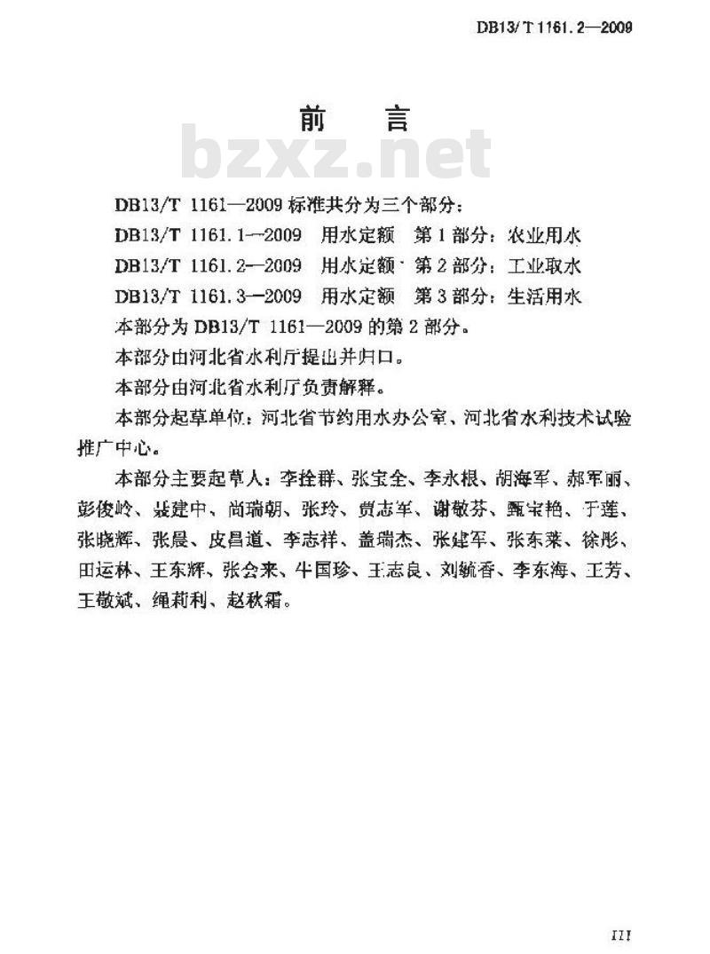 DB13/T1161.1-—2009用水定额第1部分:农业用水DB13/T1161.2-—2009用水定额-第2部分:工业取水DB13/T1161.3-—2009用水定额第3部分:生活用水本部分为DB13/T1161一2009的第2部分。本部由润北省水利厅提出并归口。本部分由河北省水利厂负责解释本部分起草单位:河北省节约用水办公室,河北省水利技术试验推广中心。