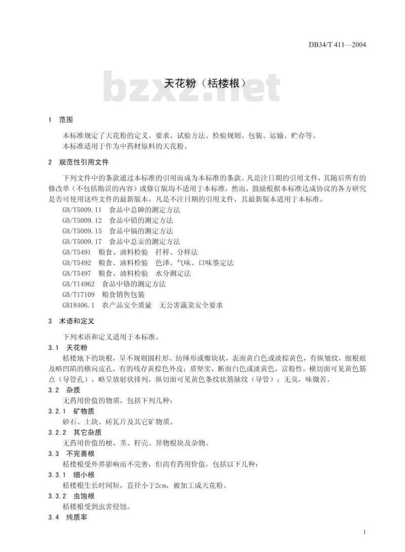 本标准规定了天花粉的定义、要求、试验方法、检验规则、包装、运输、贮存等。本标准适用于作为中药材原料的天花粉。规范性引用文件